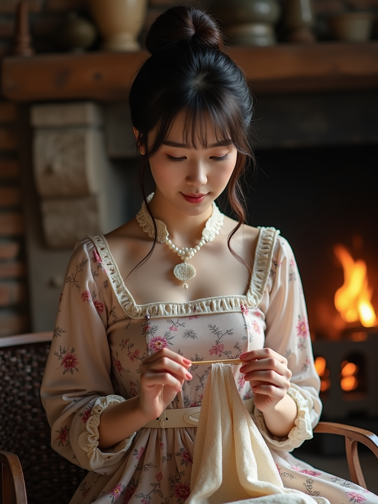 model sewing or knitting by the fireplace in a rustic living room, wearing a floral print dress with a lace collar, hair in a neat bun, with soft lighting around
