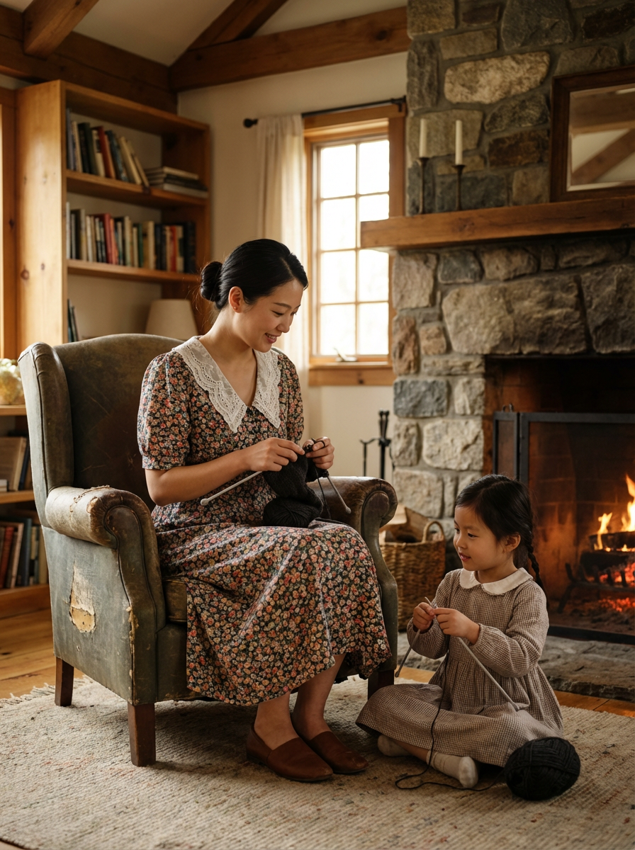 model sewing or knitting by the fireplace in a rustic living room while her young daughter learns to knit beside her, wearing a floral print dress with a lace collar, hair in a neat bun, with soft lighting around