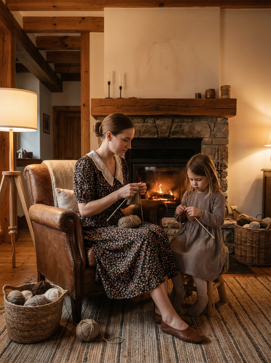 model sewing or knitting by the fireplace in a rustic living room while her young daughter learns to knit beside her, wearing a floral print dress with a lace collar, hair in a neat bun, with soft lighting around