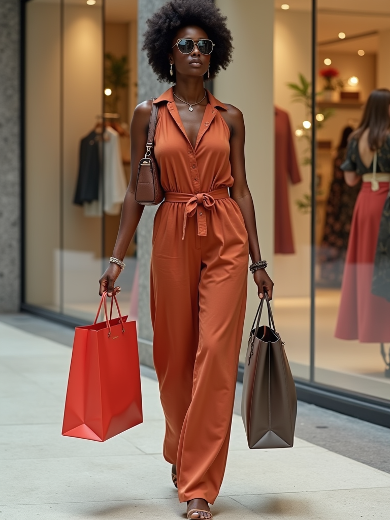 model shopping in Galeries Lafayette, wearing a chic summer jumpsuit with designer sunglasses , carrying shopping bags