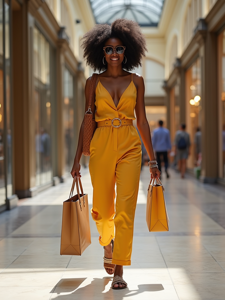model shopping in Galeries Lafayette, wearing a chic summer jumpsuit with designer sunglasses , carrying shopping bags