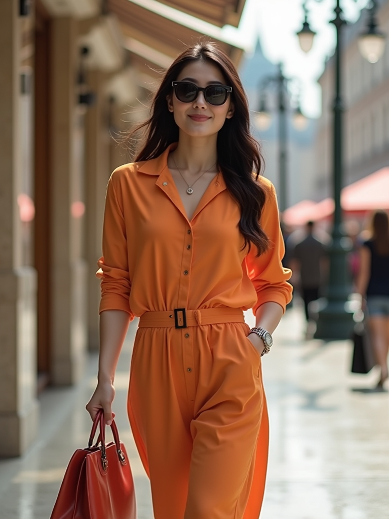 model shopping in Galeries Lafayette, wearing a chic summer jumpsuit with designer sunglasses , carrying shopping bags