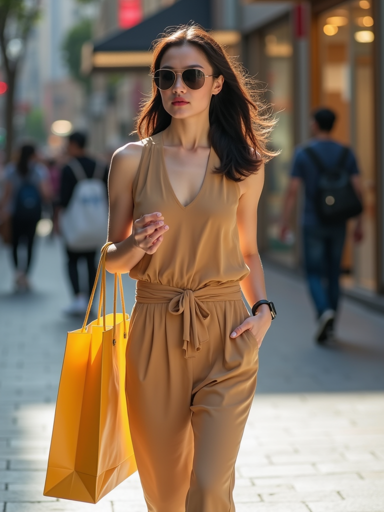 model shopping in Ginza district, wearing a chic summer jumpsuit with designer sunglasses , carrying shopping bags