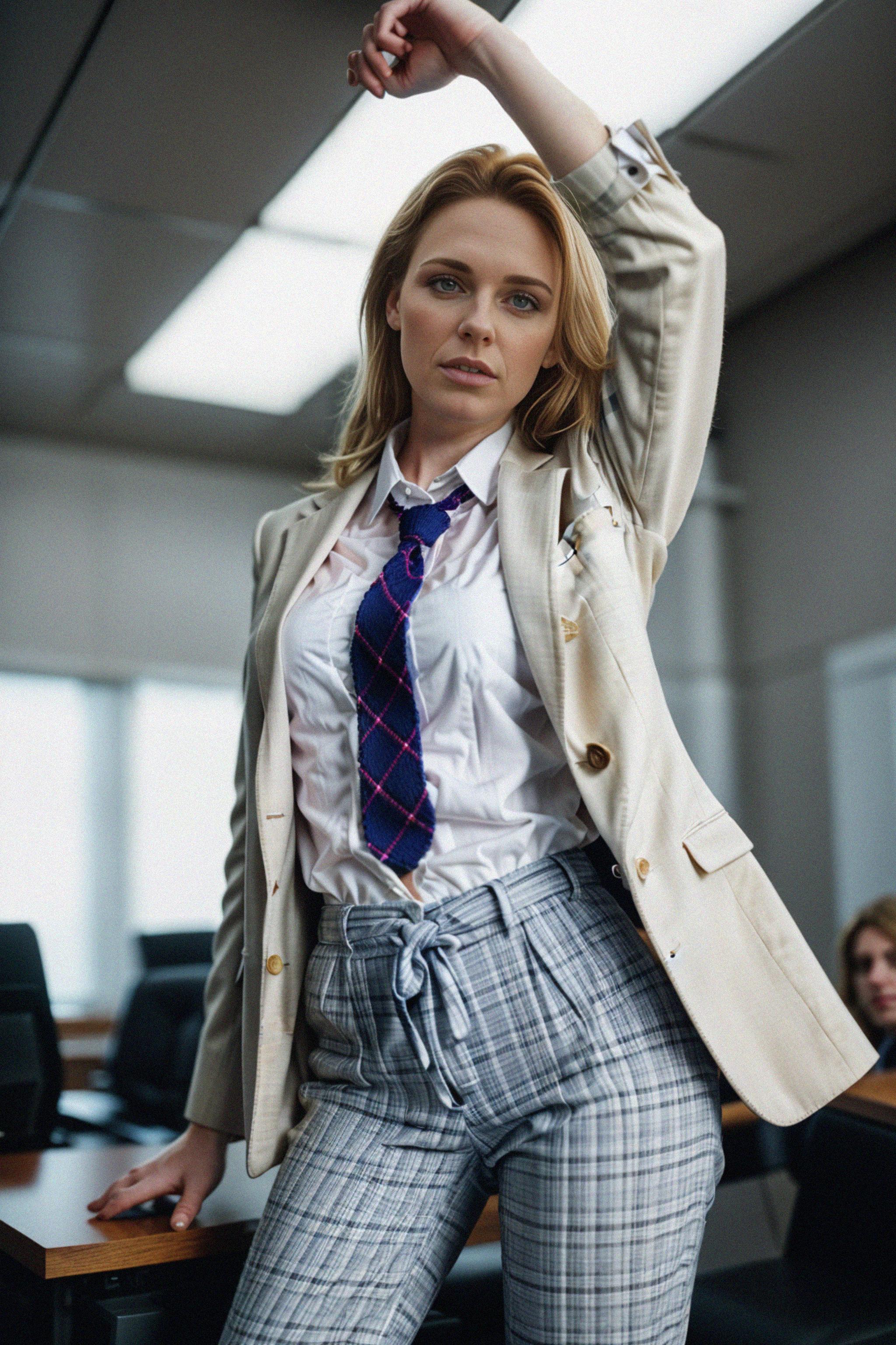 model showcasing a dappersuit in a bold plaid pattern with a solid-colored shirt and a knitted tie