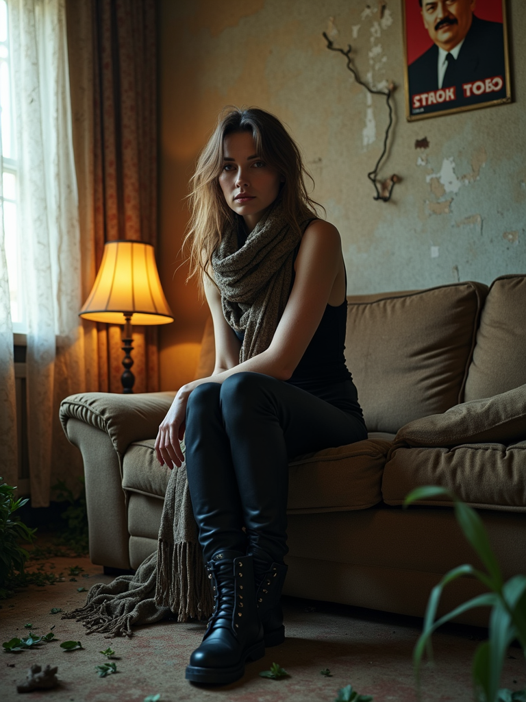 model sits on a dilapidated couch in a soviet-era apartment, wearing a faded scarf, with broken lamps and torn curtains surrounding the scene. plants growing from outside in. peeling wallpaper. poster of Stalin on wall. wearing black boots and black pants and black tank top.