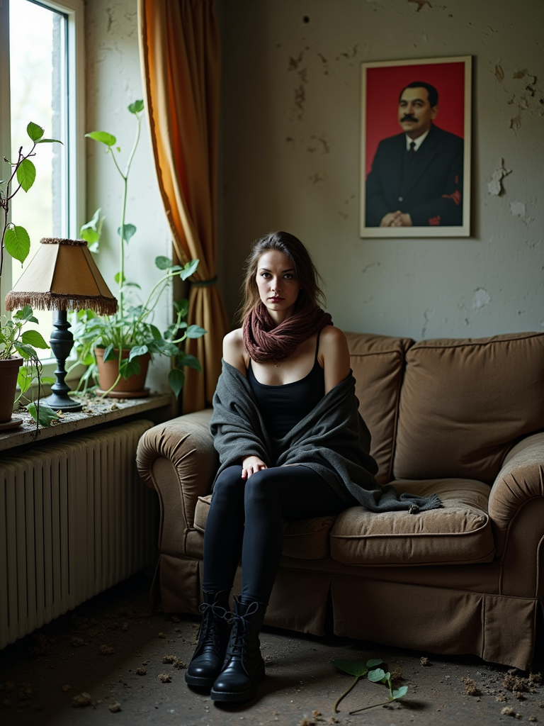 model sits on a dilapidated couch in a soviet-era apartment, wearing a faded scarf, with broken lamps and torn curtains surrounding the scene. plants growing from outside in. peeling wallpaper. poster of Stalin on wall. wearing black boots and black pants and black tank top.