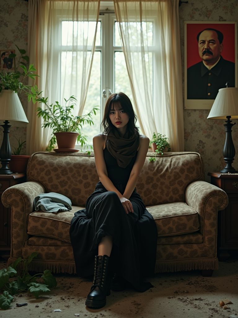 model sits on a dilapidated couch in a soviet-era apartment, wearing a faded scarf, with broken lamps and torn curtains surrounding the scene. plants growing from outside in. peeling wallpaper. poster of Stalin on wall. wearing black boots and black pants and black tank top.