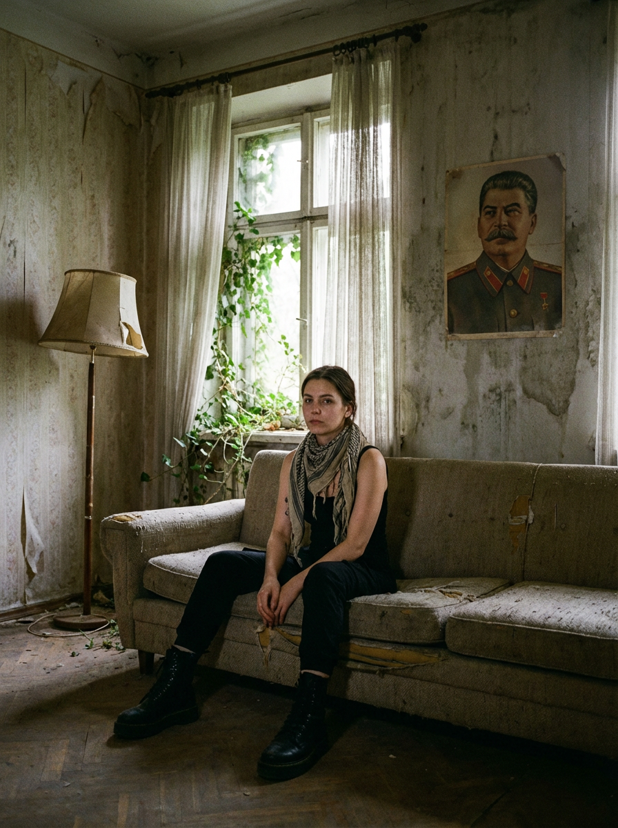 model sits on a dilapidated couch in a soviet-era apartment, wearing a faded scarf, with broken lamps and torn curtains surrounding the scene. plants growing from outside in. peeling wallpaper. poster of Stalin on wall. wearing black boots and black pants and black tank top.
