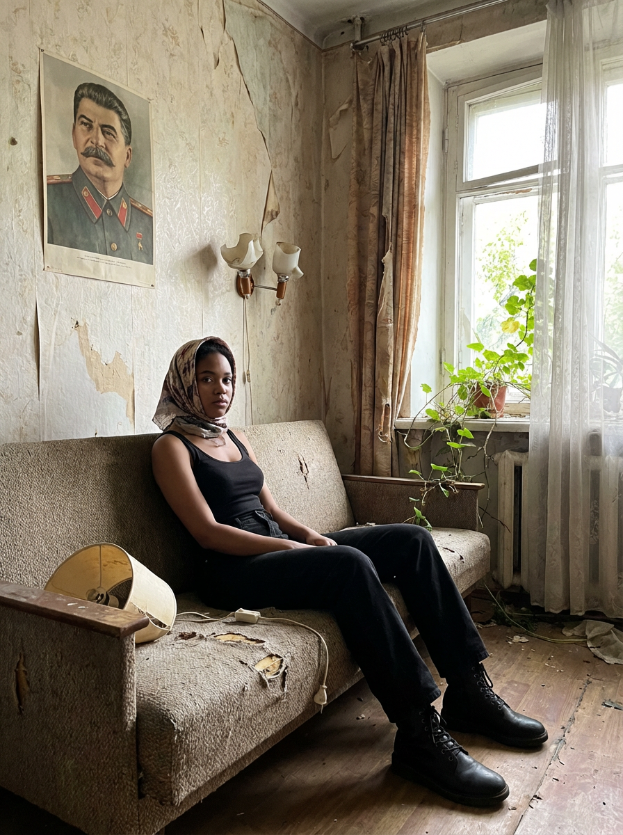 model sits on a dilapidated couch in a soviet-era apartment, wearing a faded scarf, with broken lamps and torn curtains surrounding the scene. plants growing from outside in. peeling wallpaper. poster of Stalin on wall. wearing black boots and black pants and black tank top.