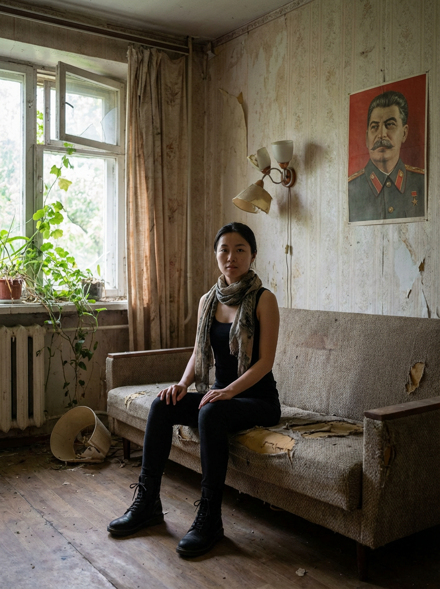model sits on a dilapidated couch in a soviet-era apartment, wearing a faded scarf, with broken lamps and torn curtains surrounding the scene. plants growing from outside in. peeling wallpaper. poster of Stalin on wall. wearing black boots and black pants and black tank top.