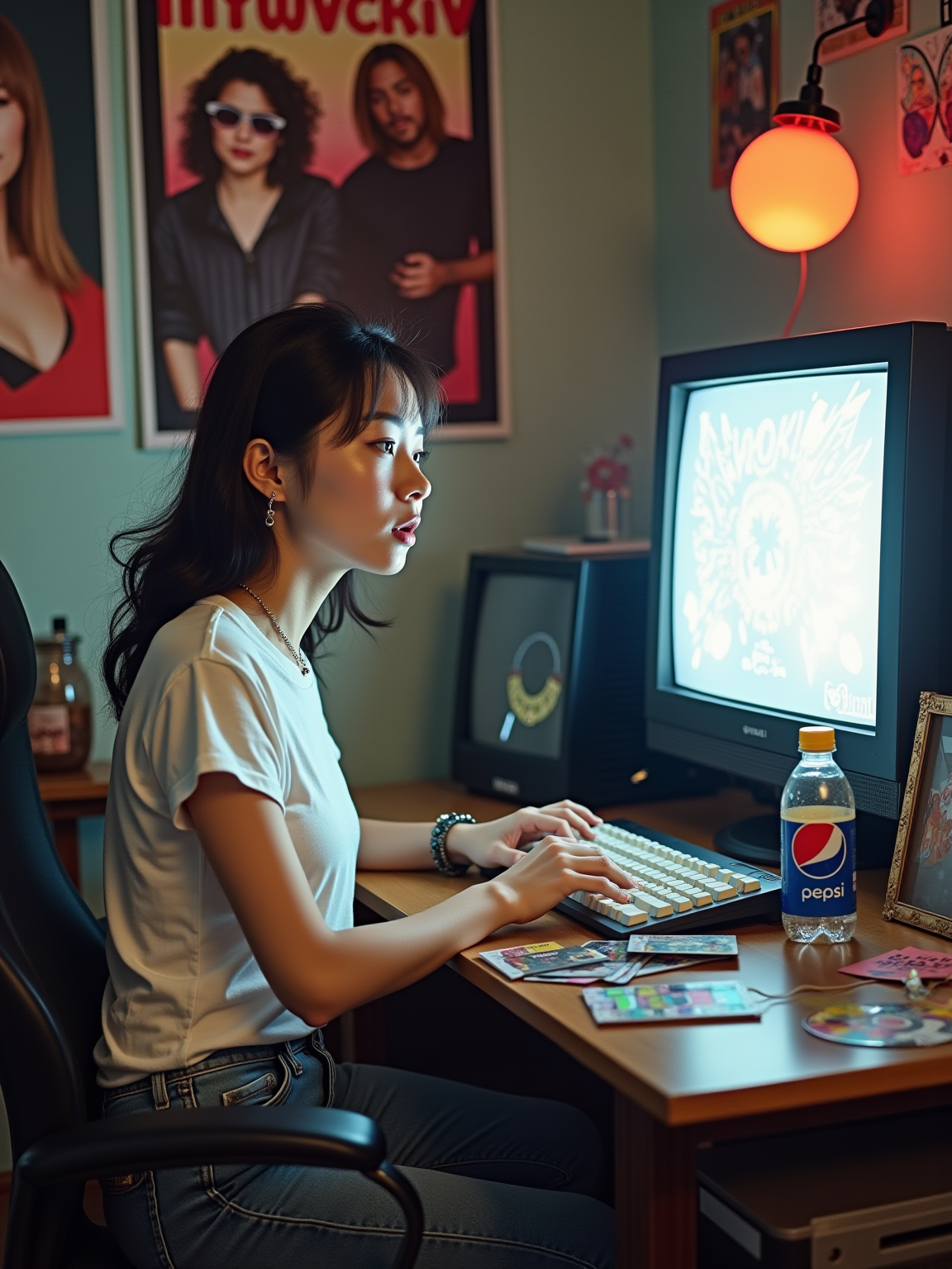 model sitting at a 2000s themed desk setup. the model is dressed in early 2000s fashion, wearing a baby tee with low-rise jeans and chunky highlights, evoking Y2K nostalgia. her expression is one of curiosity and intrigue as she interacts with the old computer setup. large posters are pinned to the wall above the desk. To the right, a bulky CRT monitor displays a screensaver. The desk is cluttered with items including CD cases, a portable CD player, and a flip phone. A framed photograph is placed beside a Pepsi Twist bottle. Items like butterfly hair clips and NOW That's What I Call Music CDs are scattered across the desk, along with various holographic stickers and concert tickets. A lava lamp illuminates the workspace, and pop star posters and CD covers decorate the surrounding walls.