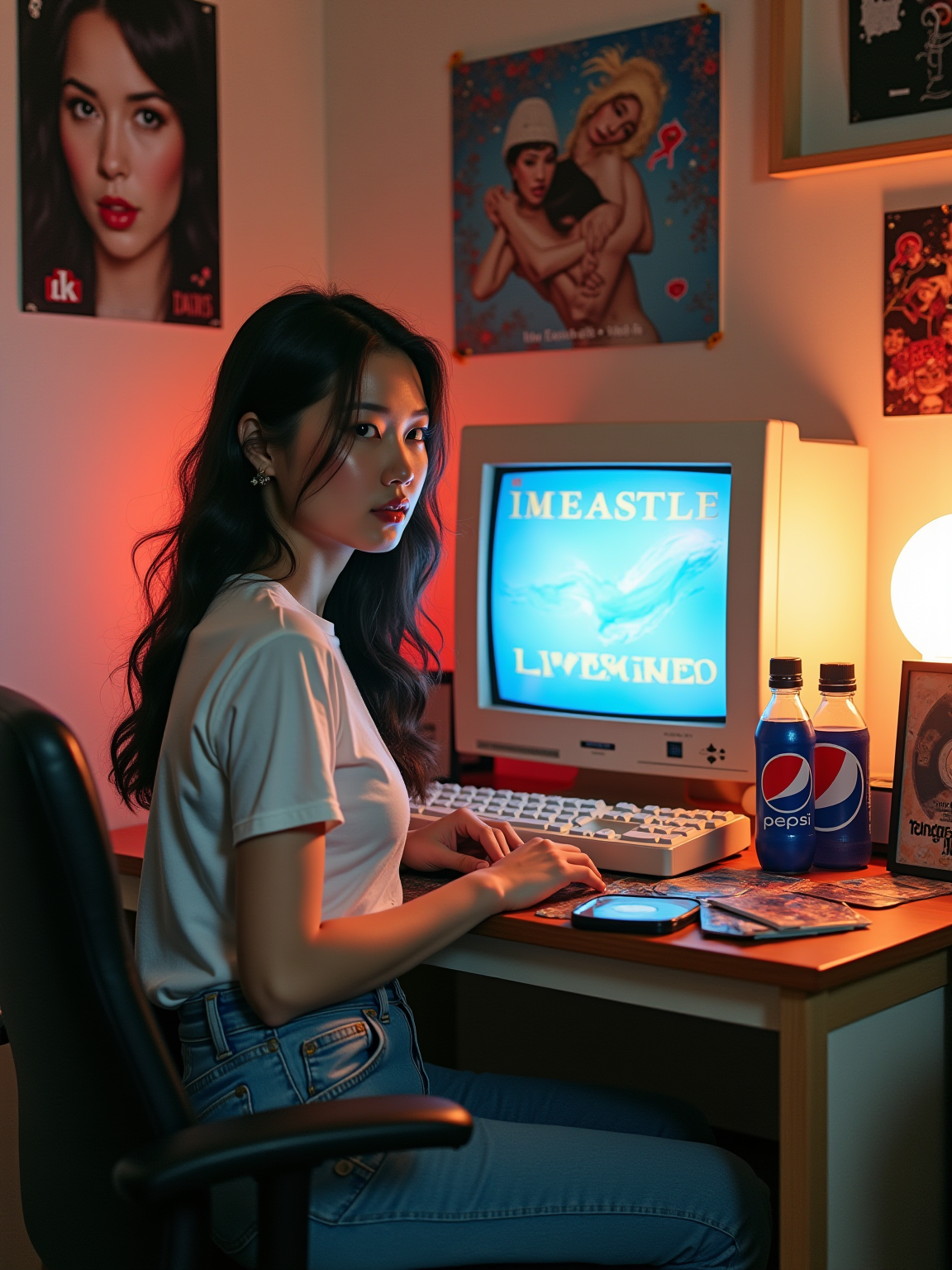 model sitting at a 2000s themed desk setup. the model is dressed in early 2000s fashion, wearing a baby tee with low-rise jeans and chunky highlights, evoking Y2K nostalgia. her expression is one of curiosity and intrigue as she interacts with the old computer setup. large posters are pinned to the wall above the desk. To the right, a bulky CRT monitor displays a screensaver. The desk is cluttered with items including CD cases, a portable CD player, and a flip phone. A framed photograph is placed beside a Pepsi Twist bottle. Items like butterfly hair clips and NOW That's What I Call Music CDs are scattered across the desk, along with various holographic stickers and concert tickets. A lava lamp illuminates the workspace, and pop star posters and CD covers decorate the surrounding walls.