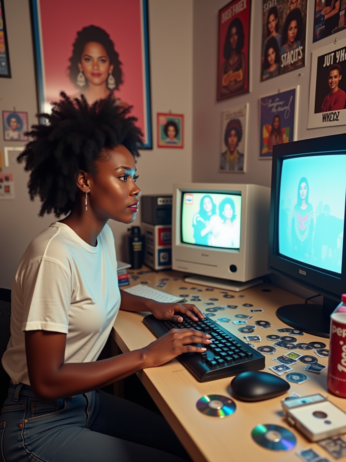 model sitting at a 2000s themed desk setup. the model is dressed in early 2000s fashion, wearing a baby tee with low-rise jeans and chunky highlights, evoking Y2K nostalgia. her expression is one of curiosity and intrigue as she interacts with the old computer setup. large posters are pinned to the wall above the desk. To the right, a bulky CRT monitor displays a screensaver. The desk is cluttered with items including CD cases, a portable CD player, and a flip phone. A framed photograph is placed beside a Pepsi Twist bottle. Items like butterfly hair clips and NOW That's What I Call Music CDs are scattered across the desk, along with various holographic stickers and concert tickets. A lava lamp illuminates the workspace, and pop star posters and CD covers decorate the surrounding walls.
