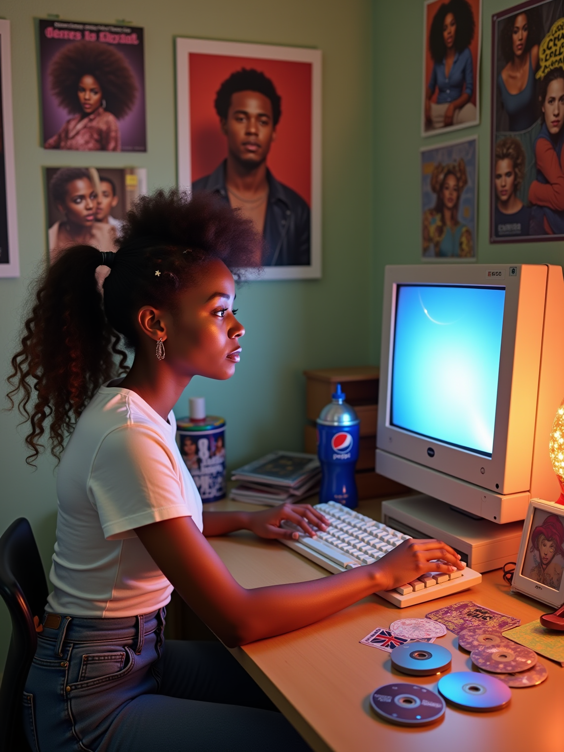 model sitting at a 2000s themed desk setup. the model is dressed in early 2000s fashion, wearing a baby tee with low-rise jeans and chunky highlights, evoking Y2K nostalgia. her expression is one of curiosity and intrigue as she interacts with the old computer setup. large posters are pinned to the wall above the desk. To the right, a bulky CRT monitor displays a screensaver. The desk is cluttered with items including CD cases, a portable CD player, and a flip phone. A framed photograph is placed beside a Pepsi Twist bottle. Items like butterfly hair clips and NOW That's What I Call Music CDs are scattered across the desk, along with various holographic stickers and concert tickets. A lava lamp illuminates the workspace, and pop star posters and CD covers decorate the surrounding walls.