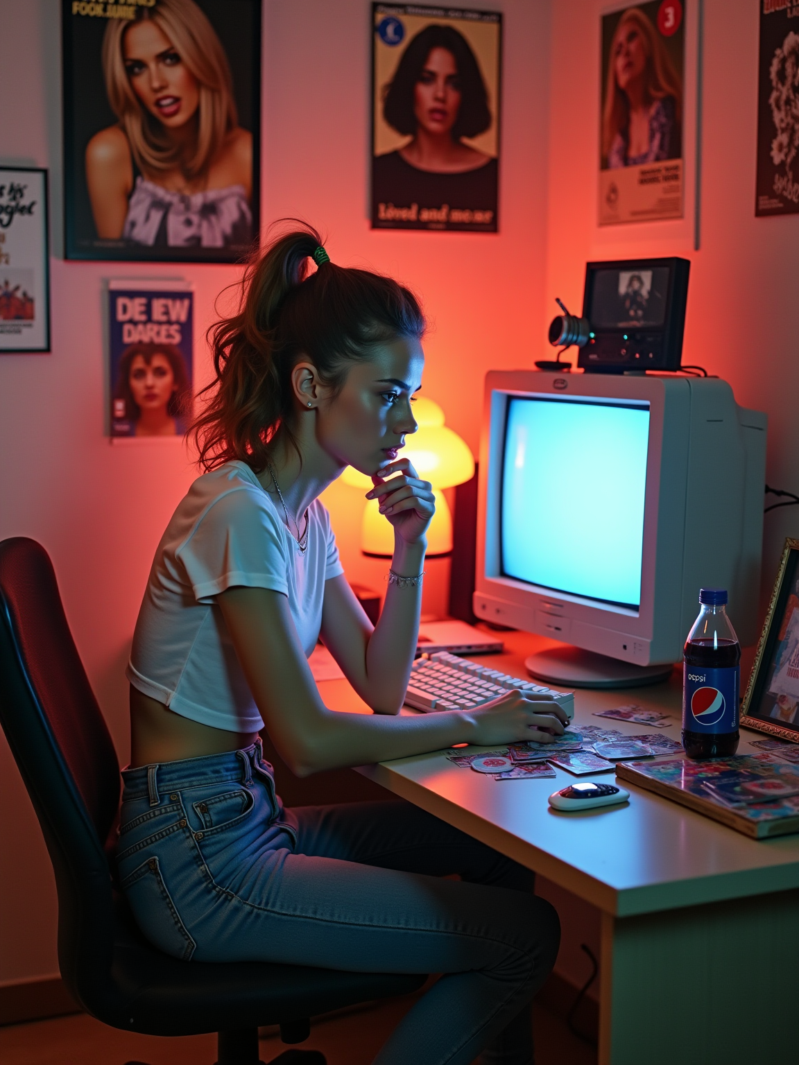 model sitting at a 2000s themed desk setup. the model is dressed in early 2000s fashion, wearing a baby tee with low-rise jeans and chunky highlights, evoking Y2K nostalgia. her expression is one of curiosity and intrigue as she interacts with the old computer setup. large posters are pinned to the wall above the desk. To the right, a bulky CRT monitor displays a screensaver. The desk is cluttered with items including CD cases, a portable CD player, and a flip phone. A framed photograph is placed beside a Pepsi Twist bottle. Items like butterfly hair clips and NOW That's What I Call Music CDs are scattered across the desk, along with various holographic stickers and concert tickets. A lava lamp illuminates the workspace, and pop star posters and CD covers decorate the surrounding walls.