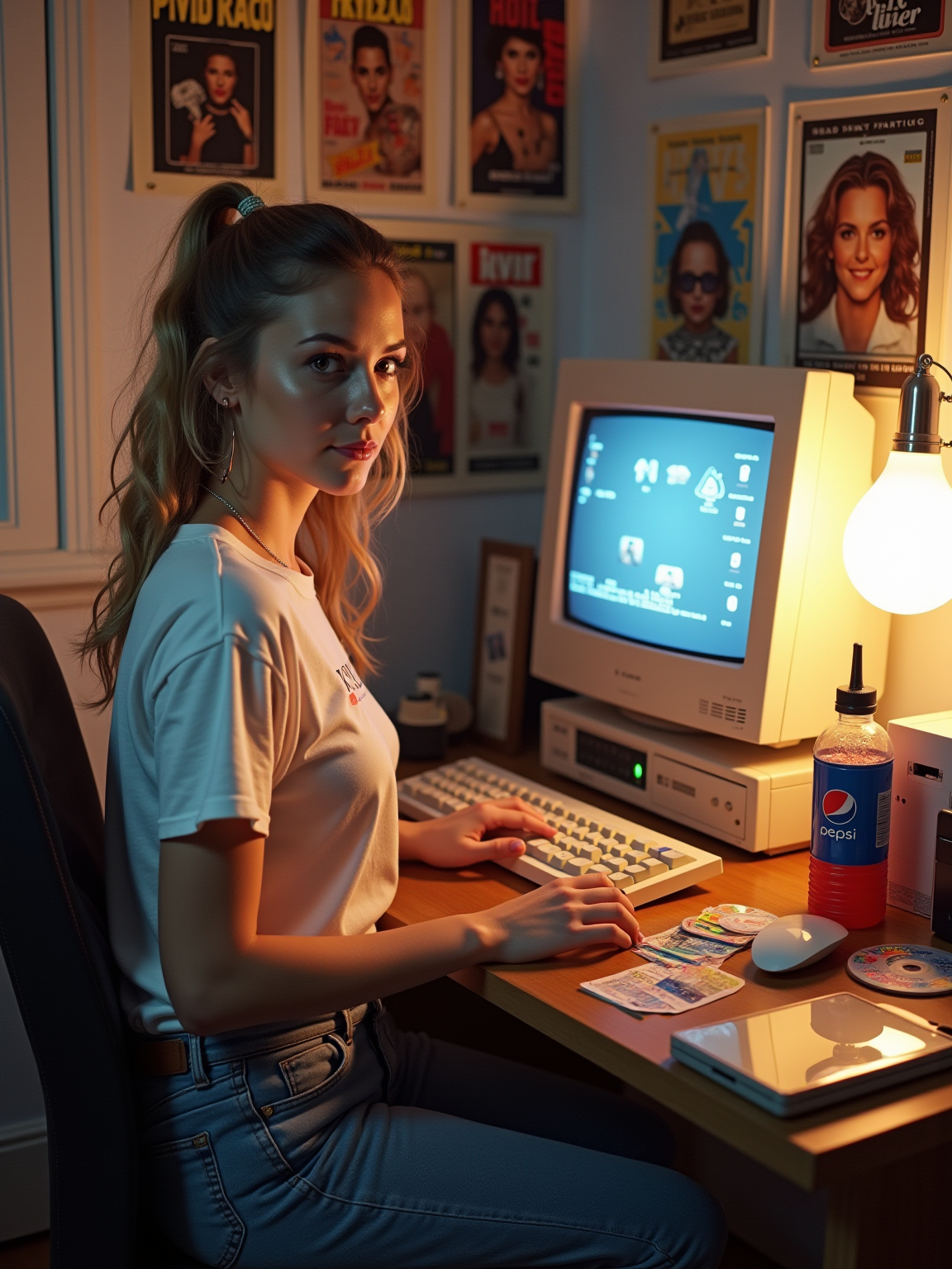model sitting at a 2000s themed desk setup. the model is dressed in early 2000s fashion, wearing a baby tee with low-rise jeans and chunky highlights, evoking Y2K nostalgia. her expression is one of curiosity and intrigue as she interacts with the old computer setup. large posters are pinned to the wall above the desk. To the right, a bulky CRT monitor displays a screensaver. The desk is cluttered with items including CD cases, a portable CD player, and a flip phone. A framed photograph is placed beside a Pepsi Twist bottle. Items like butterfly hair clips and NOW That's What I Call Music CDs are scattered across the desk, along with various holographic stickers and concert tickets. A lava lamp illuminates the workspace, and pop star posters and CD covers decorate the surrounding walls.