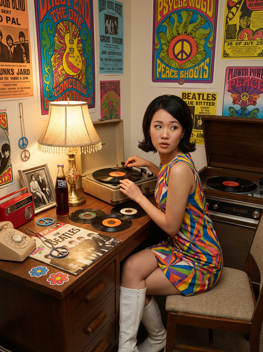 model sitting at a 60s themed desk setup. the model is dressed in 1960s fashion, wearing a colorful geometric patterned shift dress and go-go boots, evoking a sense of mod nostalgia. her expression is one of curiosity and intrigue as she interacts with the old turntable. large posters are pinned to the wall above the desk. To the right, a vintage stereo with record player displays spinning vinyl. The desk is cluttered with items including vinyl 45s, a transistor radio, and a rotary phone. A framed photograph is placed beside a Tab cola bottle. Items like peace sign jewelry and Beatles albums are scattered across the desk, along with various flower power stickers and concert tickets. A beaded lamp illuminates the workspace, and psychedelic posters and album covers decorate the surrounding walls.