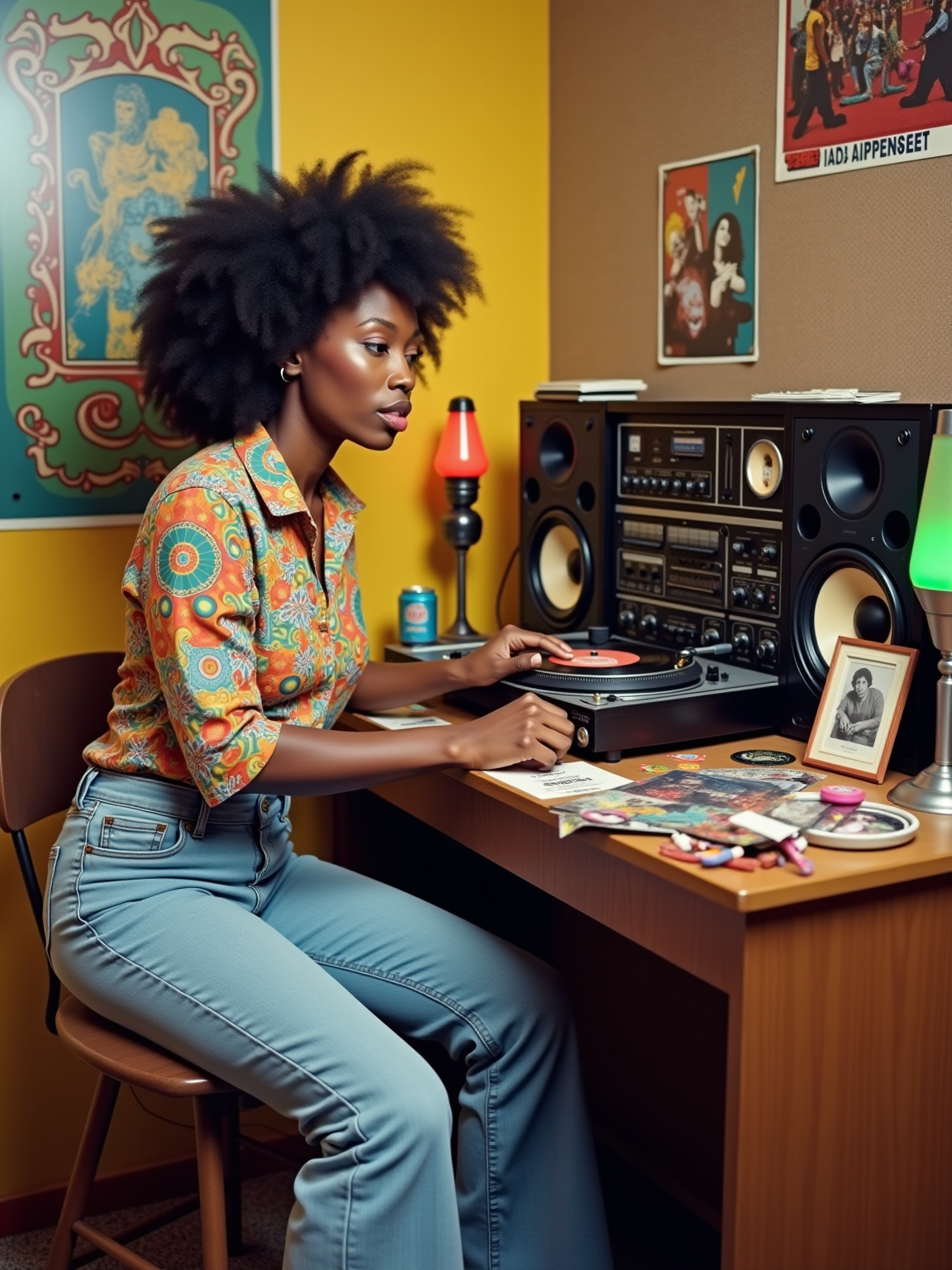model sitting at a 70s themed desk setup. the model is dressed in 1970s fashion, wearing a colorful psychedelic shirt and bell-bottom jeans, evoking a sense of groovy nostalgia. her expression is one of curiosity and intrigue as she interacts with the old stereo system. large posters are pinned to the wall above the desk. To the right, a vintage stereo with large speakers displays a turntable. The desk is cluttered with items including vinyl records, a lava lamp, and an 8-track player. A framed photograph is placed beside a Tab cola can. Toys, like a mood ring and record albums, are scattered across the desk, along with various peace sign stickers and concert tickets. A beaded lamp illuminates the workspace, and groovy posters and album covers decorate the surrounding walls.