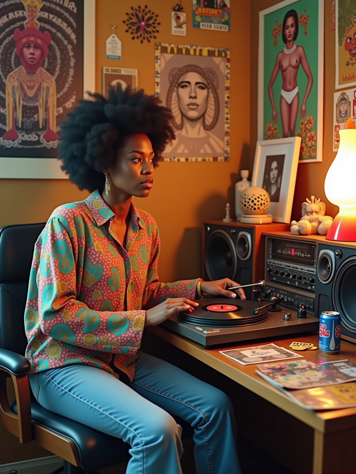 model sitting at a 70s themed desk setup. the model is dressed in 1970s fashion, wearing a colorful psychedelic shirt and bell-bottom jeans, evoking a sense of groovy nostalgia. her expression is one of curiosity and intrigue as she interacts with the old stereo system. large posters are pinned to the wall above the desk. To the right, a vintage stereo with large speakers displays a turntable. The desk is cluttered with items including vinyl records, a lava lamp, and an 8-track player. A framed photograph is placed beside a Tab cola can. Toys, like a mood ring and record albums, are scattered across the desk, along with various peace sign stickers and concert tickets. A beaded lamp illuminates the workspace, and groovy posters and album covers decorate the surrounding walls.