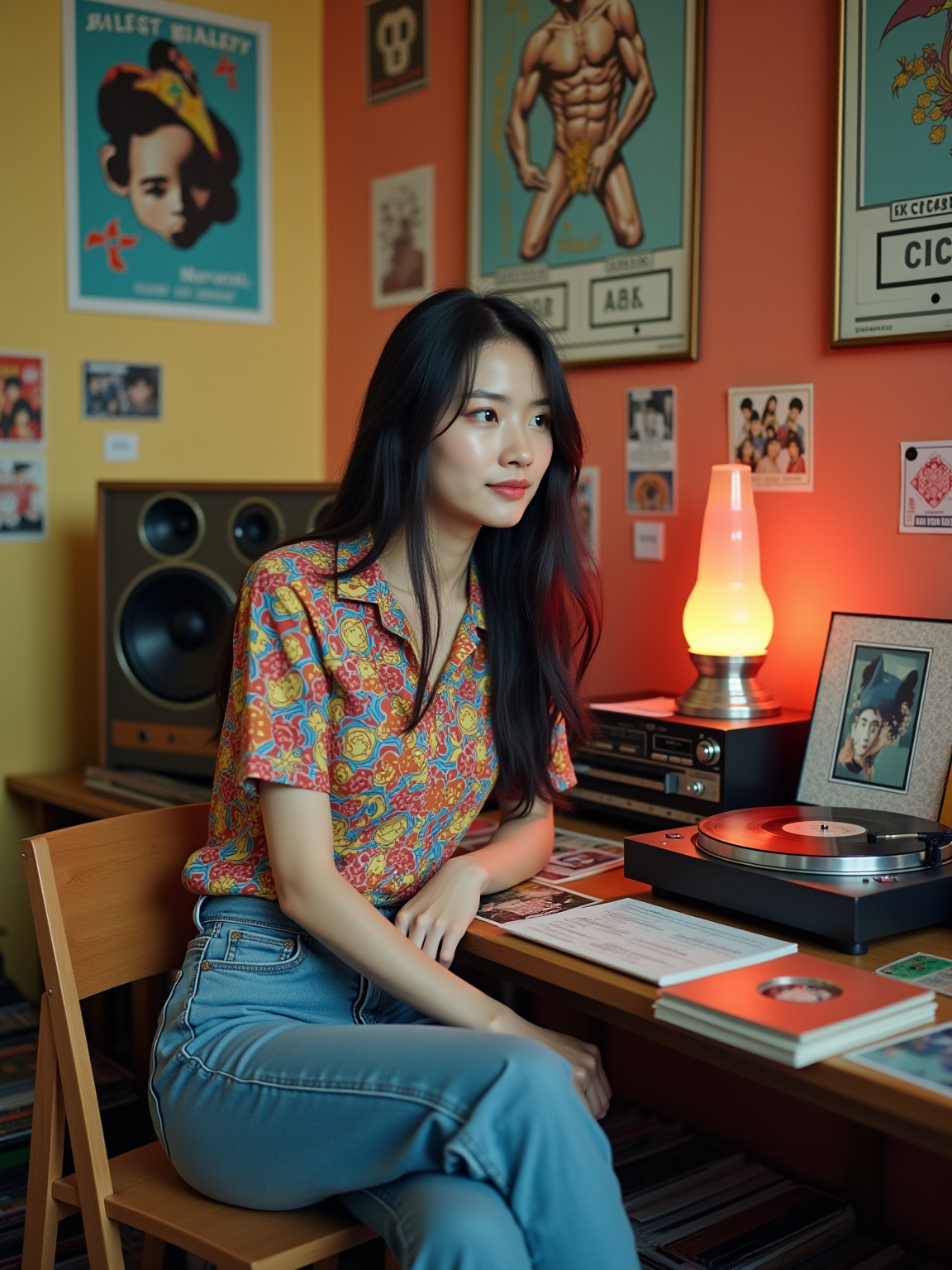 model sitting at a 70s themed desk setup. the model is dressed in 1970s fashion, wearing a colorful psychedelic shirt and bell-bottom jeans, evoking a sense of groovy nostalgia. her expression is one of curiosity and intrigue as she interacts with the old stereo system. large posters are pinned to the wall above the desk. To the right, a vintage stereo with large speakers displays a turntable. The desk is cluttered with items including vinyl records, a lava lamp, and an 8-track player. A framed photograph is placed beside a Tab cola can. Toys, like a mood ring and record albums, are scattered across the desk, along with various peace sign stickers and concert tickets. A beaded lamp illuminates the workspace, and groovy posters and album covers decorate the surrounding walls.