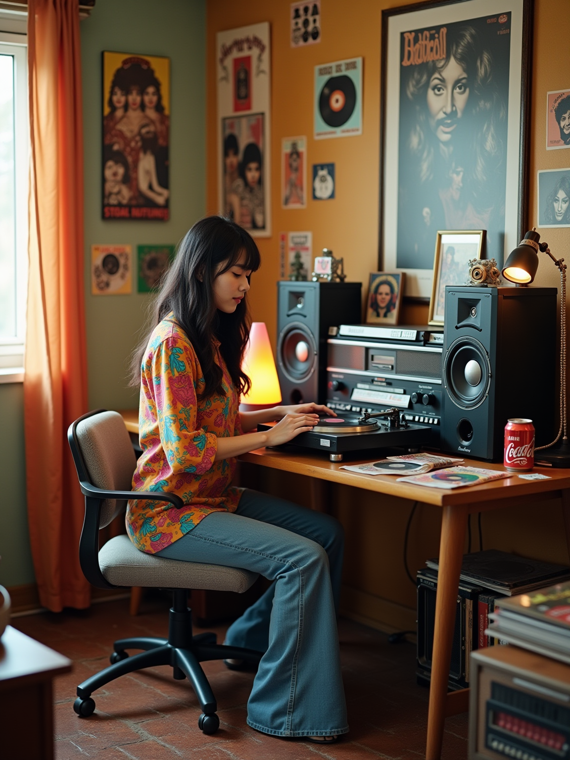 model sitting at a 70s themed desk setup. the model is dressed in 1970s fashion, wearing a colorful psychedelic shirt and bell-bottom jeans, evoking a sense of groovy nostalgia. her expression is one of curiosity and intrigue as she interacts with the old stereo system. large posters are pinned to the wall above the desk. To the right, a vintage stereo with large speakers displays a turntable. The desk is cluttered with items including vinyl records, a lava lamp, and an 8-track player. A framed photograph is placed beside a Tab cola can. Toys, like a mood ring and record albums, are scattered across the desk, along with various peace sign stickers and concert tickets. A beaded lamp illuminates the workspace, and groovy posters and album covers decorate the surrounding walls.