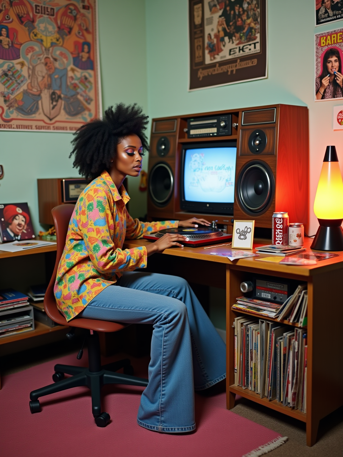 model sitting at a 70s themed desk setup. the model is dressed in 1970s fashion, wearing a colorful psychedelic shirt and bell-bottom jeans, evoking a sense of groovy nostalgia. her expression is one of curiosity and intrigue as she interacts with the old stereo system. large posters are pinned to the wall above the desk. To the right, a vintage stereo with large speakers displays a turntable. The desk is cluttered with items including vinyl records, a lava lamp, and an 8-track player. A framed photograph is placed beside a Tab cola can. Toys, like a mood ring and record albums, are scattered across the desk, along with various peace sign stickers and concert tickets. A beaded lamp illuminates the workspace, and groovy posters and album covers decorate the surrounding walls.