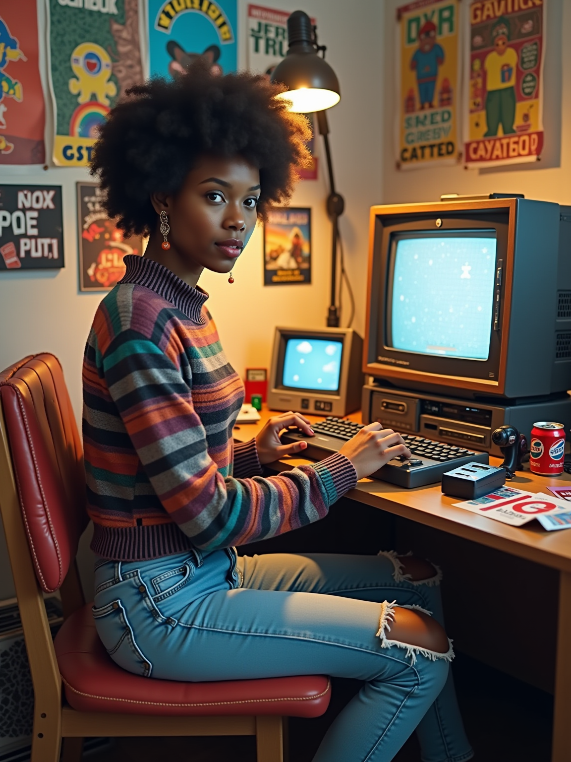 model sitting at a 80s/90s themed desk setup. the model is dressed in 1990s fashion, wearing a colorful patterned sweater and high-waisted ripped blue jeans, evoking a sense of nostalgia. her expression is one of curiosity and intrigue as she interacts with the old computer. large posters are pinned to the wall above the desk. To the right, a vintage computer monitor displays a pixelated game screen. The desk is cluttered with items including a joystick, a cassette player, and a calculator. A framed photograph of a child is placed beside a Pepsi can. Toys, like a toy truck and cassette cases, are scattered across the desk, along with various gaming-related stickers and cards. An adjustable desk lamp illuminates the workspace, and colorful posters and flyers decorate the surrounding walls.