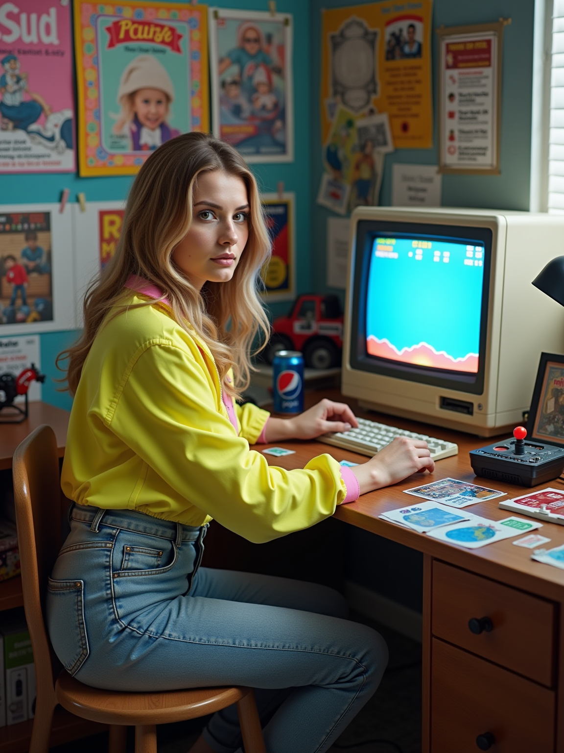 model sitting at a 80s themed desk setup. the model is dressed in 1980s fashion, wearing a neon windbreaker and high-waisted acid wash jeans, evoking a sense of nostalgia. her expression is one of curiosity and intrigue as she interacts with the old computer. large posters are pinned to the wall above the desk. To the right, a vintage computer monitor displays a pixelated game screen. The desk is cluttered with items including a joystick, a cassette player, and a calculator. A framed photograph of a child is placed beside a Pepsi can. Toys, like a toy truck and cassette cases, are scattered across the desk, along with various gaming-related stickers and cards. An adjustable desk lamp illuminates the workspace, and colorful posters and flyers decorate the surrounding walls.