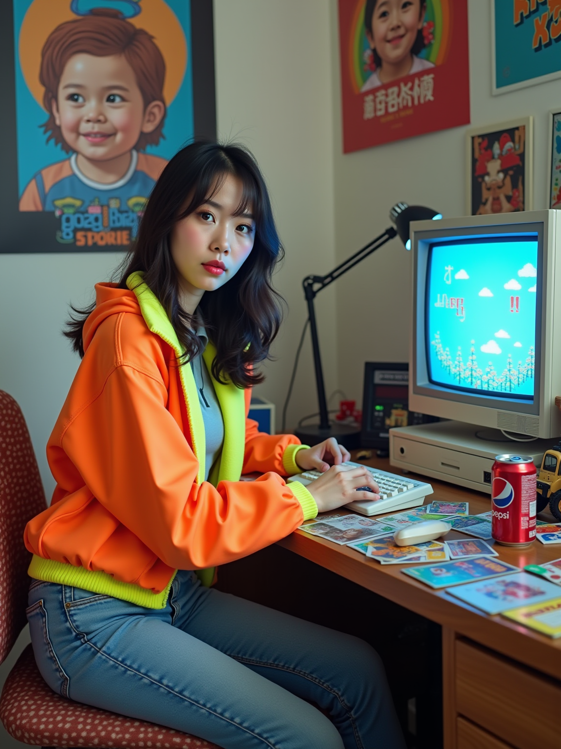 model sitting at a 80s themed desk setup. the model is dressed in 1980s fashion, wearing a neon windbreaker and high-waisted acid wash jeans, evoking a sense of nostalgia. her expression is one of curiosity and intrigue as she interacts with the old computer. large posters are pinned to the wall above the desk. To the right, a vintage computer monitor displays a pixelated game screen. The desk is cluttered with items including a joystick, a cassette player, and a calculator. A framed photograph of a child is placed beside a Pepsi can. Toys, like a toy truck and cassette cases, are scattered across the desk, along with various gaming-related stickers and cards. An adjustable desk lamp illuminates the workspace, and colorful posters and flyers decorate the surrounding walls.