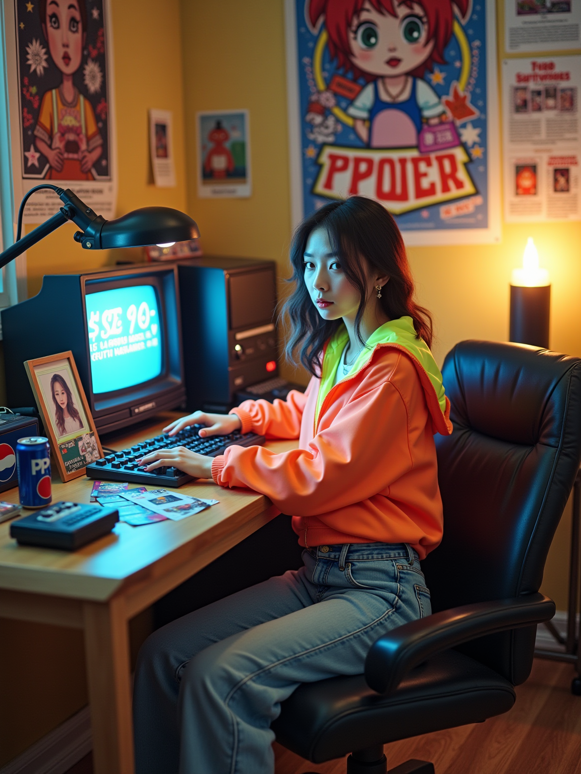 model sitting at a 80s themed desk setup. the model is dressed in 1980s fashion, wearing a neon windbreaker and high-waisted acid wash jeans, evoking a sense of nostalgia. her expression is one of curiosity and intrigue as she interacts with the old computer. large posters are pinned to the wall above the desk. To the right, a vintage computer monitor displays a pixelated game screen. The desk is cluttered with items including a joystick, a cassette player, and a calculator. A framed photograph of a child is placed beside a Pepsi can. Toys, like a toy truck and cassette cases, are scattered across the desk, along with various gaming-related stickers and cards. An adjustable desk lamp illuminates the workspace, and colorful posters and flyers decorate the surrounding walls.