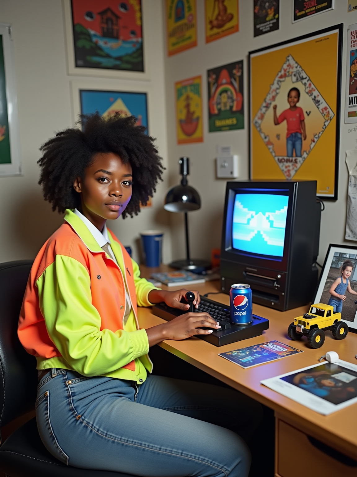 model sitting at a 80s themed desk setup. the model is dressed in 1980s fashion, wearing a neon windbreaker and high-waisted acid wash jeans, evoking a sense of nostalgia. her expression is one of curiosity and intrigue as she interacts with the old computer. large posters are pinned to the wall above the desk. To the right, a vintage computer monitor displays a pixelated game screen. The desk is cluttered with items including a joystick, a cassette player, and a calculator. A framed photograph of a child is placed beside a Pepsi can. Toys, like a toy truck and cassette cases, are scattered across the desk, along with various gaming-related stickers and cards. An adjustable desk lamp illuminates the workspace, and colorful posters and flyers decorate the surrounding walls.