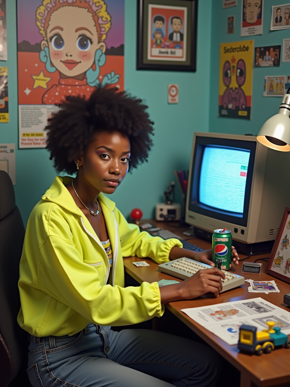 model sitting at a 80s themed desk setup. the model is dressed in 1980s fashion, wearing a neon windbreaker and high-waisted acid wash jeans, evoking a sense of nostalgia. her expression is one of curiosity and intrigue as she interacts with the old computer. large posters are pinned to the wall above the desk. To the right, a vintage computer monitor displays a pixelated game screen. The desk is cluttered with items including a joystick, a cassette player, and a calculator. A framed photograph of a child is placed beside a Pepsi can. Toys, like a toy truck and cassette cases, are scattered across the desk, along with various gaming-related stickers and cards. An adjustable desk lamp illuminates the workspace, and colorful posters and flyers decorate the surrounding walls.