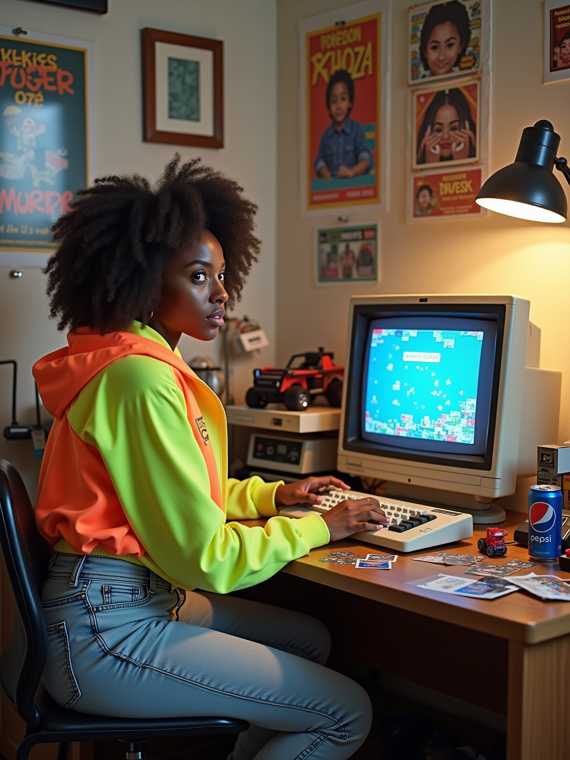 model sitting at a 80s themed desk setup. the model is dressed in 1980s fashion, wearing a neon windbreaker and high-waisted acid wash jeans, evoking a sense of nostalgia. her expression is one of curiosity and intrigue as she interacts with the old computer. large posters are pinned to the wall above the desk. To the right, a vintage computer monitor displays a pixelated game screen. The desk is cluttered with items including a joystick, a cassette player, and a calculator. A framed photograph of a child is placed beside a Pepsi can. Toys, like a toy truck and cassette cases, are scattered across the desk, along with various gaming-related stickers and cards. An adjustable desk lamp illuminates the workspace, and colorful posters and flyers decorate the surrounding walls.
