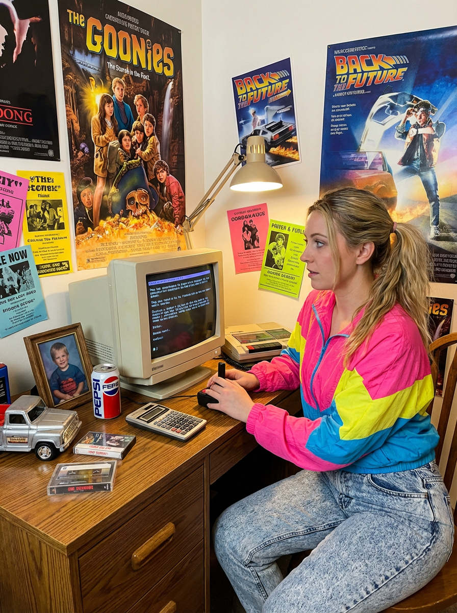 model sitting at a 80s themed desk setup. the model is dressed in 1980s fashion, wearing a neon windbreaker and high-waisted acid wash jeans, evoking a sense of nostalgia. her expression is one of curiosity and intrigue as she interacts with the old computer. large posters are pinned to the wall above the desk. To the right, a vintage computer monitor displays a pixelated game screen. The desk is cluttered with items including a joystick, a cassette player, and a calculator. A framed photograph of a child is placed beside a Pepsi can. Toys, like a toy truck and cassette cases, are scattered across the desk, along with various gaming-related stickers and cards. An adjustable desk lamp illuminates the workspace, and colorful posters and flyers decorate the surrounding walls.