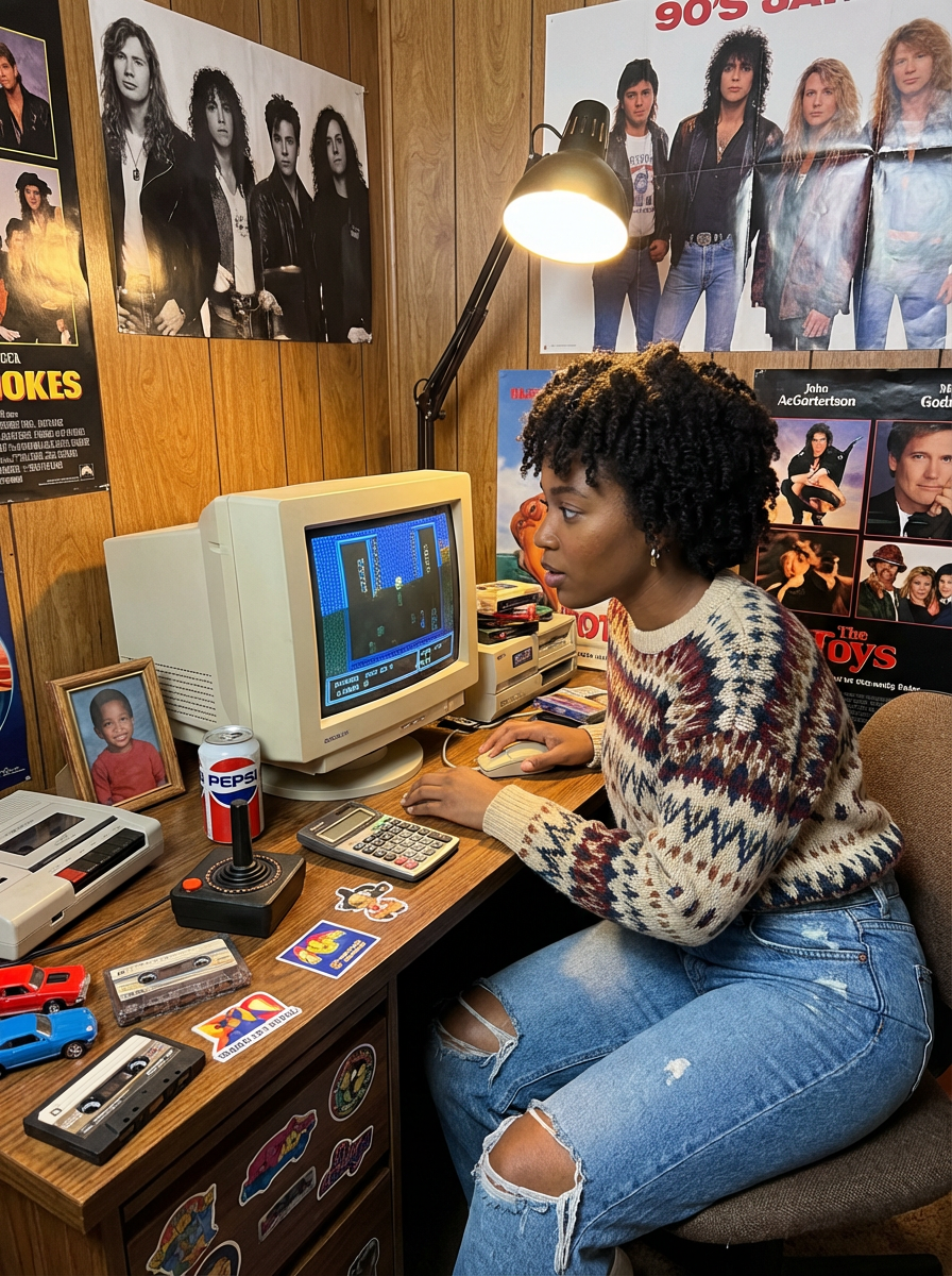 model sitting at a 90s themed desk setup. the model is dressed in 1990s fashion, wearing a colorful patterned sweater and high-waisted ripped blue jeans, evoking a sense of nostalgia. her expression is one of curiosity and intrigue as she interacts with the old computer. large posters are pinned to the wall above the desk. To the right, a vintage computer monitor displays a pixelated game screen. The desk is cluttered with items including a joystick, a cassette player, and a calculator. A framed photograph of a child is placed beside a Pepsi can. Toys, like a toy truck and cassette cases, are scattered across the desk, along with various gaming-related stickers and cards. An adjustable desk lamp illuminates the workspace, and colorful posters and flyers decorate the surrounding walls.