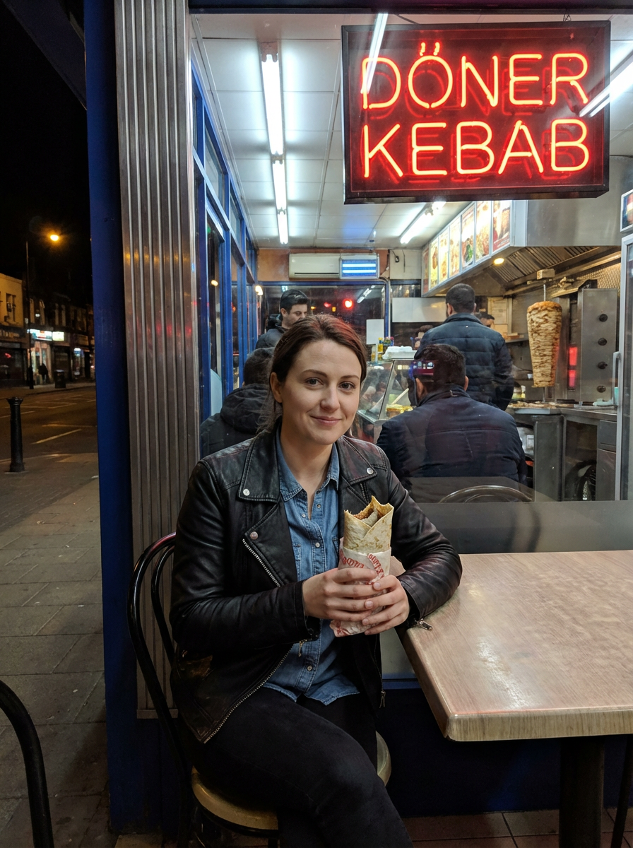 model sitting at an indoor Doner Kebab Takeaway Restaurant at night. the model wears black leather jacket. neon light say "döner kebab" in caps.