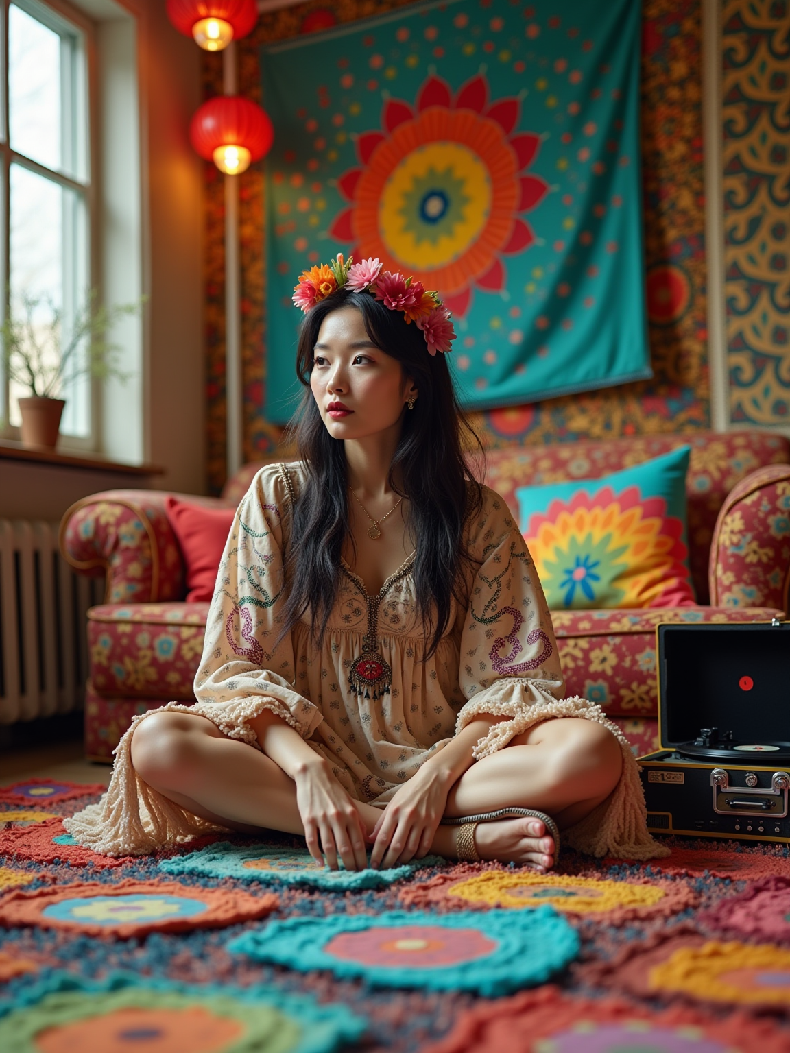 model sitting cross-legged on a colorful shag rug, wearing a peasant dress with flower crown and sandals , organizing a collection of Beatles and Motown singles, portable record player with detachable speakers nearby, inflatable furniture and psychedelic tapestries decorating the room