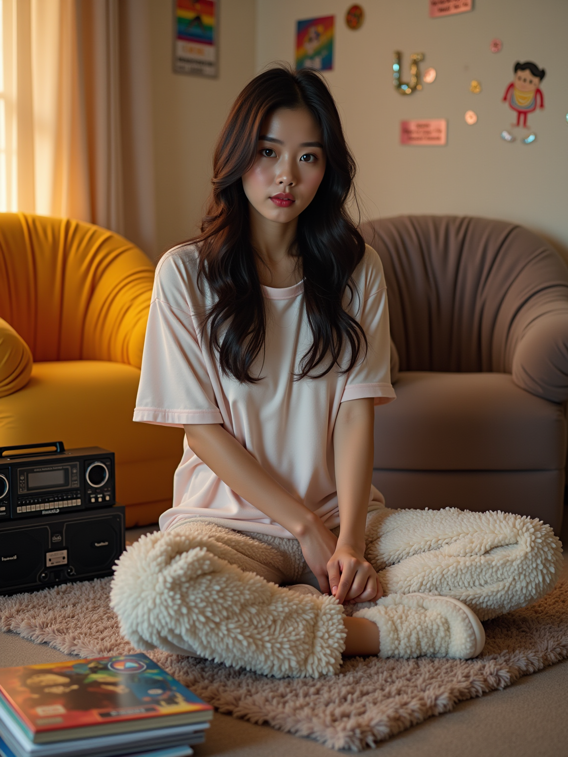 model sitting cross-legged on a fuzzy rug, wearing a baby tee with pajama pants and fuzzy slippers , organizing a collection of mix CDs and original albums, portable stereo with dual cassette deck nearby, inflatable chairs and metallic wall decals decorating the room