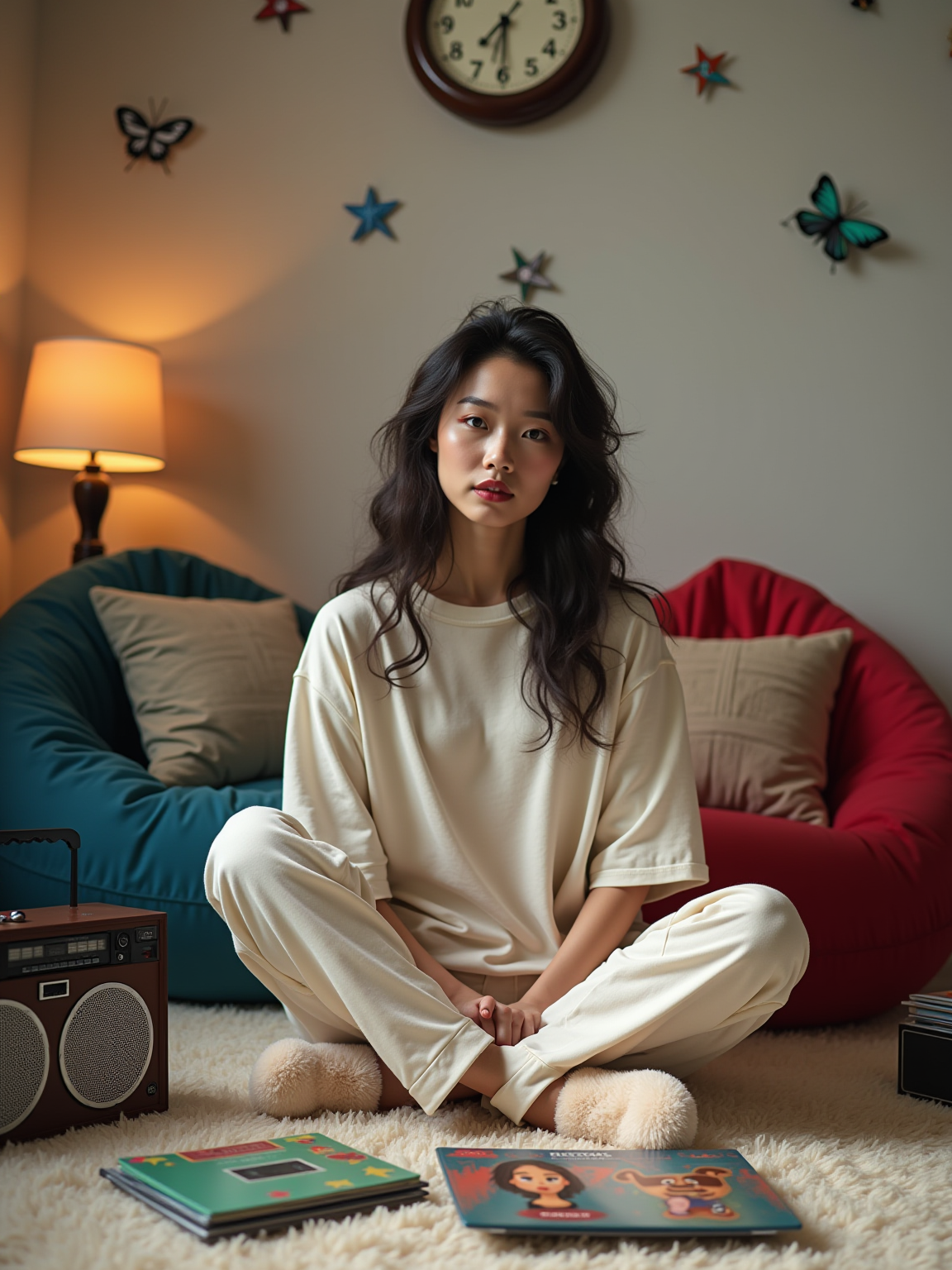 model sitting cross-legged on a fuzzy rug, wearing a baby tee with pajama pants and fuzzy slippers , organizing a collection of mix CDs and original albums, portable stereo with dual cassette deck nearby, inflatable chairs and metallic wall decals decorating the room