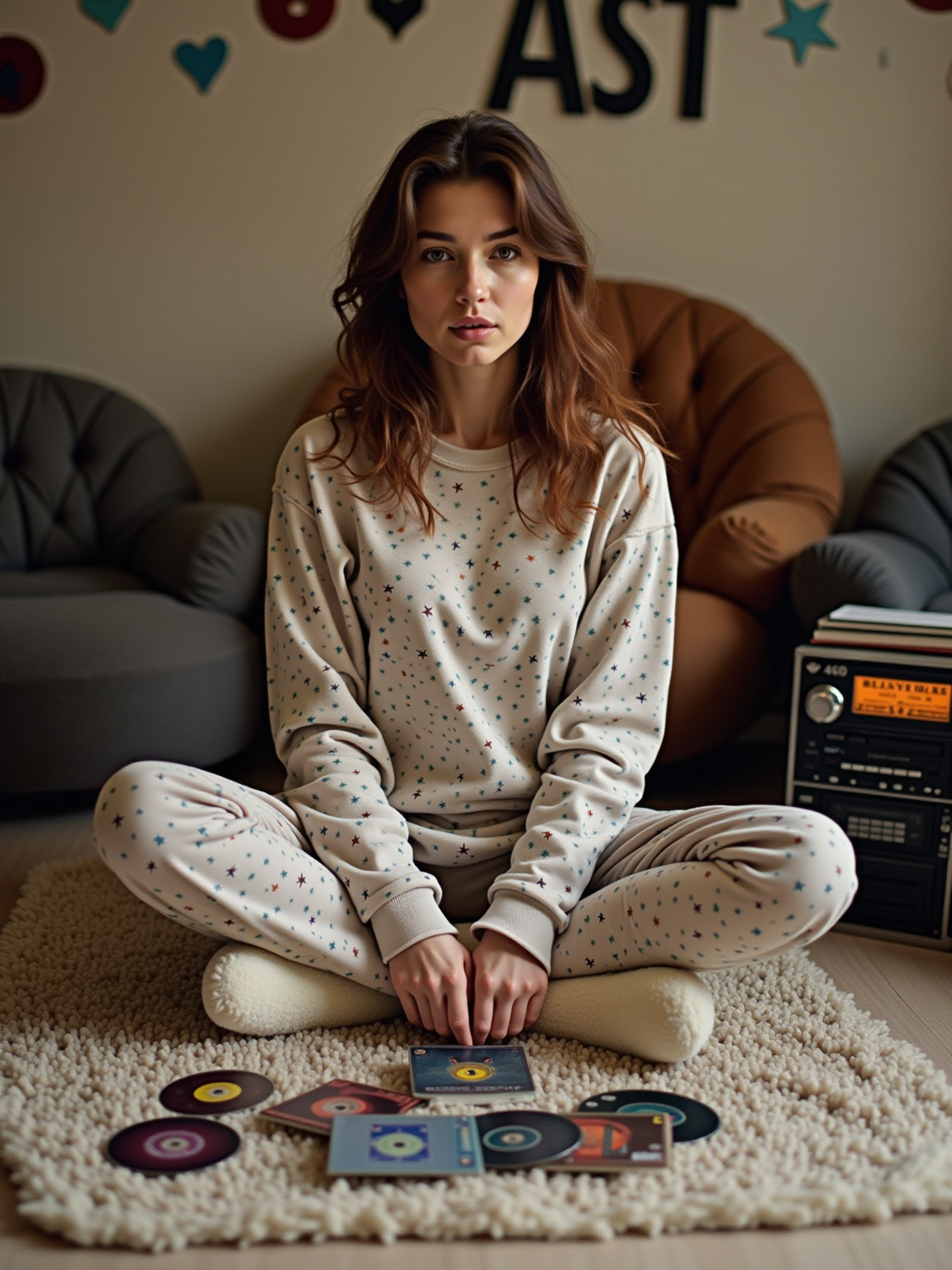 model sitting cross-legged on a fuzzy rug, wearing a baby tee with pajama pants and fuzzy slippers , organizing a collection of mix CDs and original albums, portable stereo with dual cassette deck nearby, inflatable chairs and metallic wall decals decorating the room
