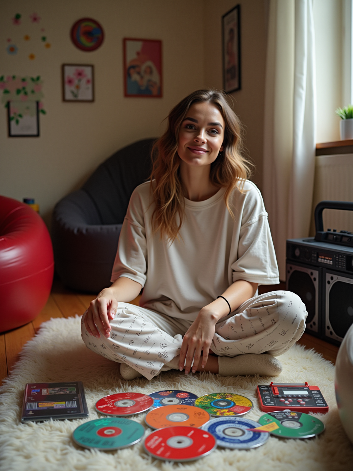 model sitting cross-legged on a fuzzy rug, wearing a baby tee with pajama pants and fuzzy slippers , organizing a collection of mix CDs and original albums, portable stereo with dual cassette deck nearby, inflatable chairs and metallic wall decals decorating the room