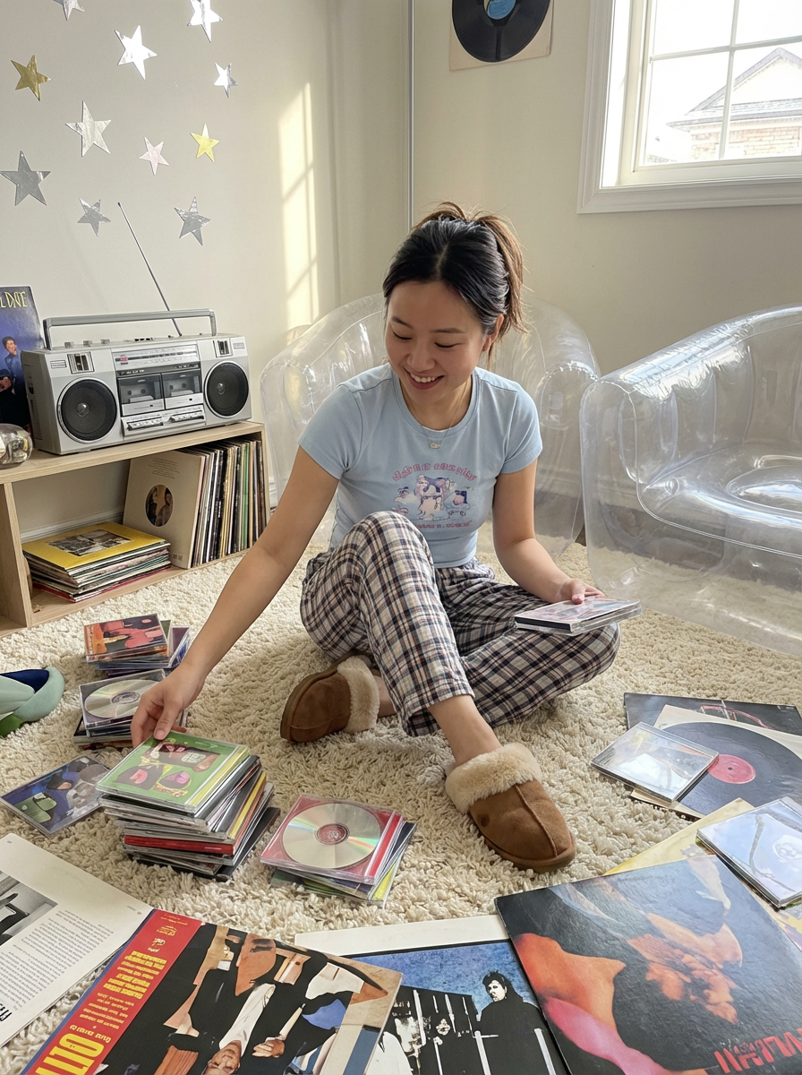 model sitting cross-legged on a fuzzy rug, wearing a baby tee with pajama pants and fuzzy slippers , organizing a collection of mix CDs and original albums, portable stereo with dual cassette deck nearby, inflatable chairs and metallic wall decals decorating the room