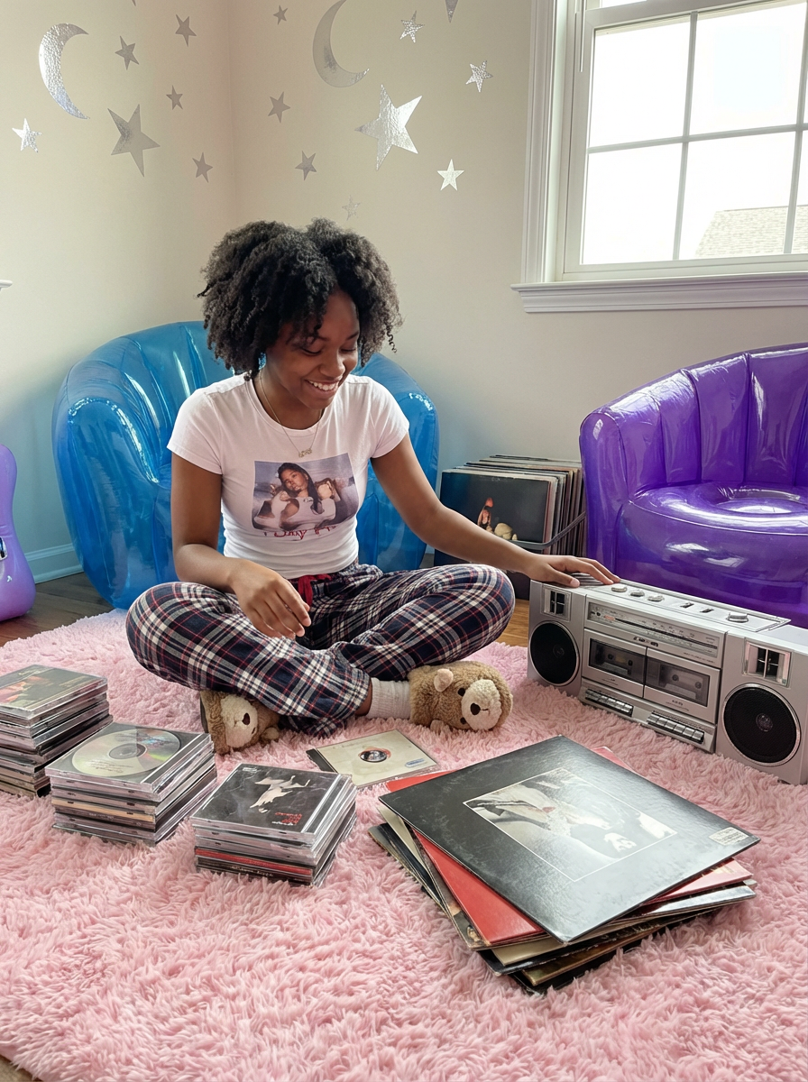 model sitting cross-legged on a fuzzy rug, wearing a baby tee with pajama pants and fuzzy slippers , organizing a collection of mix CDs and original albums, portable stereo with dual cassette deck nearby, inflatable chairs and metallic wall decals decorating the room