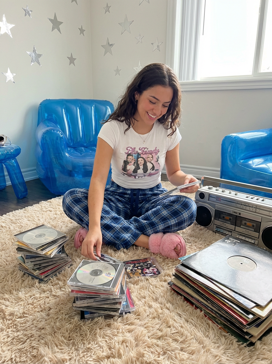 model sitting cross-legged on a fuzzy rug, wearing a baby tee with pajama pants and fuzzy slippers , organizing a collection of mix CDs and original albums, portable stereo with dual cassette deck nearby, inflatable chairs and metallic wall decals decorating the room