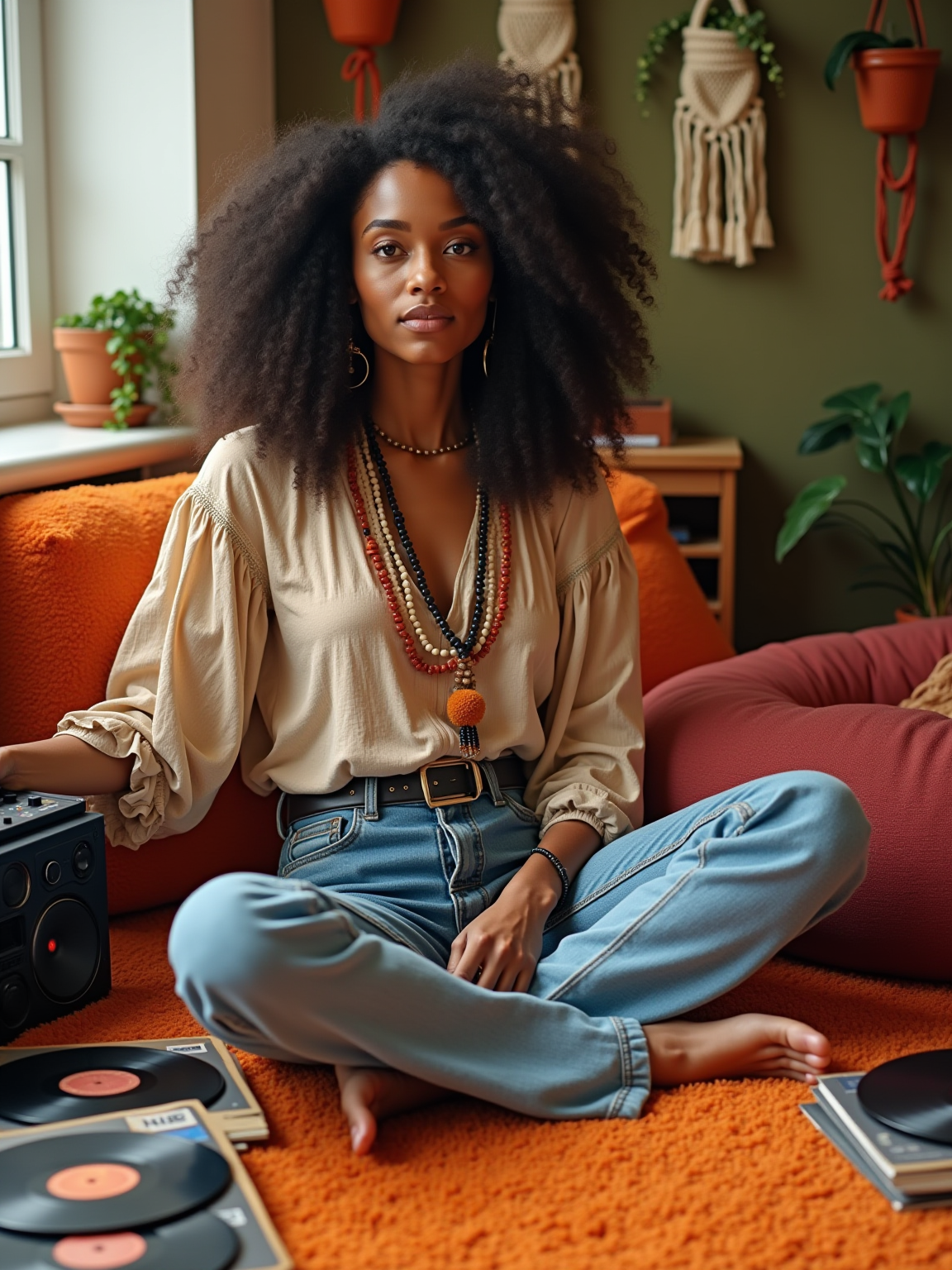 model sitting cross-legged on orange shag carpet, wearing peasant blouse with bell-bottom jeans and love beads , organizing a collection of vinyl LPs and 45s, portable stereo with cassette deck nearby, bean bag chairs and hanging macramé planters decorating the room