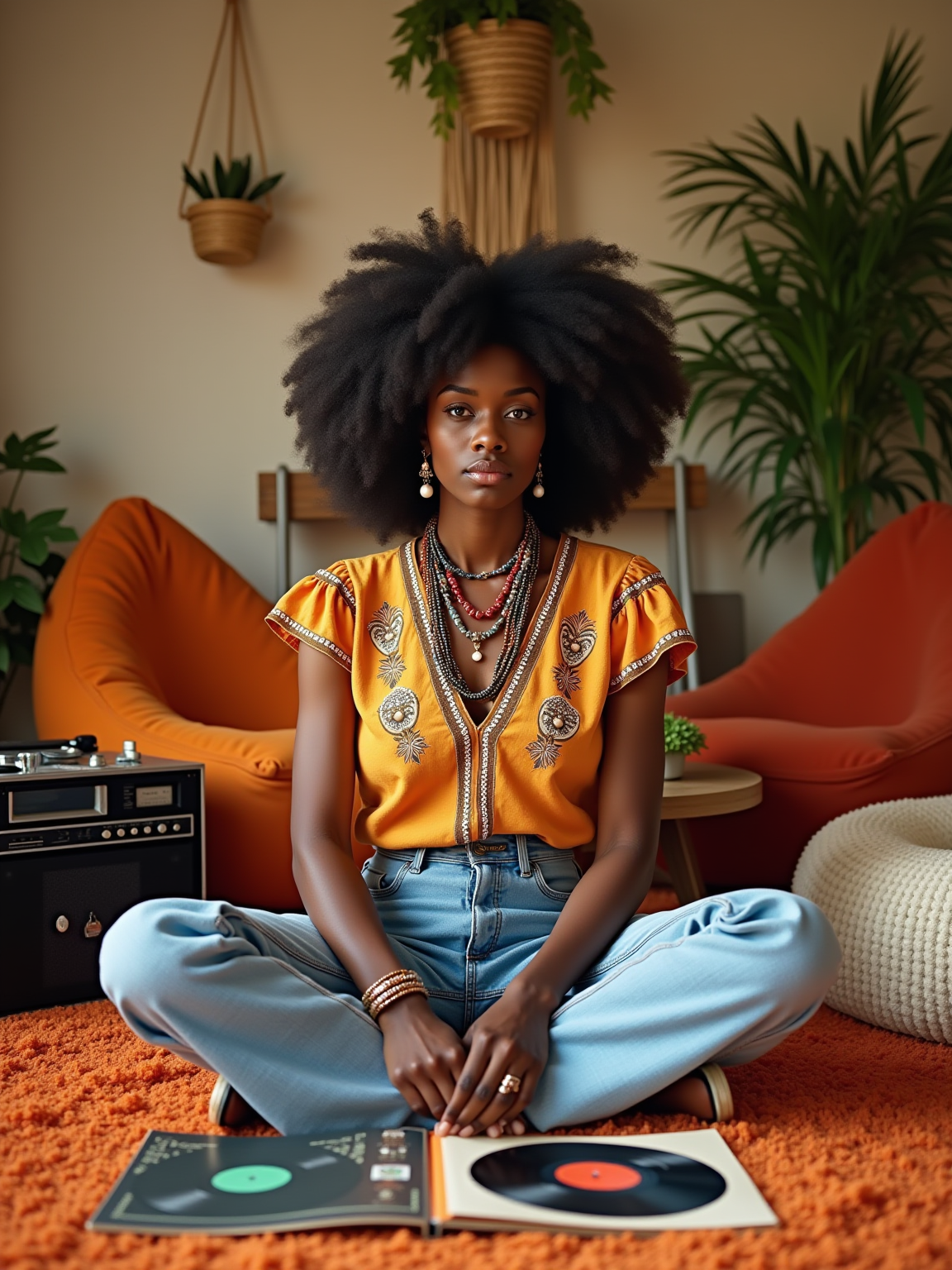 model sitting cross-legged on orange shag carpet, wearing peasant blouse with bell-bottom jeans and love beads , organizing a collection of vinyl LPs and 45s, portable stereo with cassette deck nearby, bean bag chairs and hanging macramé planters decorating the room
