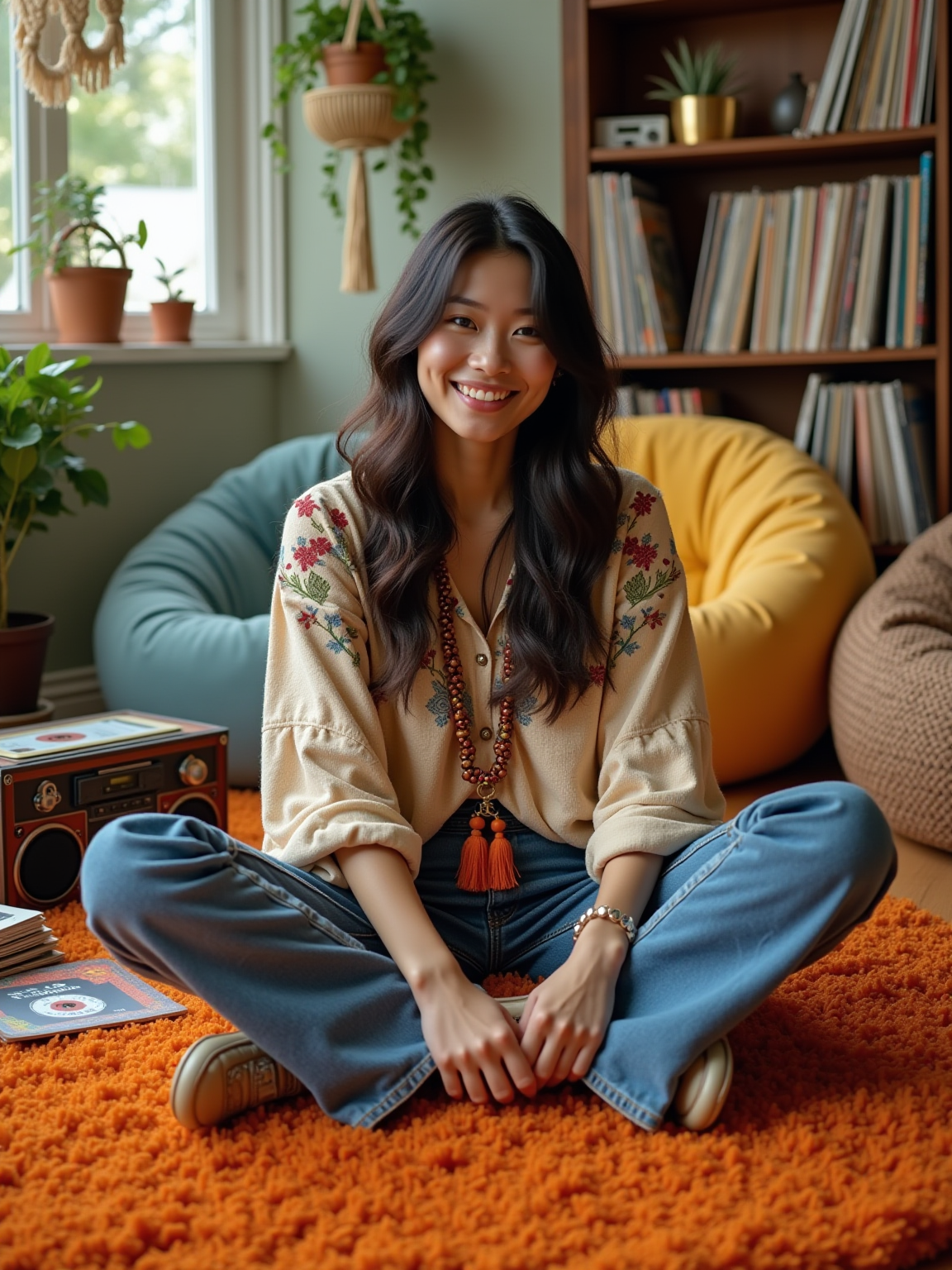 model sitting cross-legged on orange shag carpet, wearing peasant blouse with bell-bottom jeans and love beads , organizing a collection of vinyl LPs and 45s, portable stereo with cassette deck nearby, bean bag chairs and hanging macramé planters decorating the room