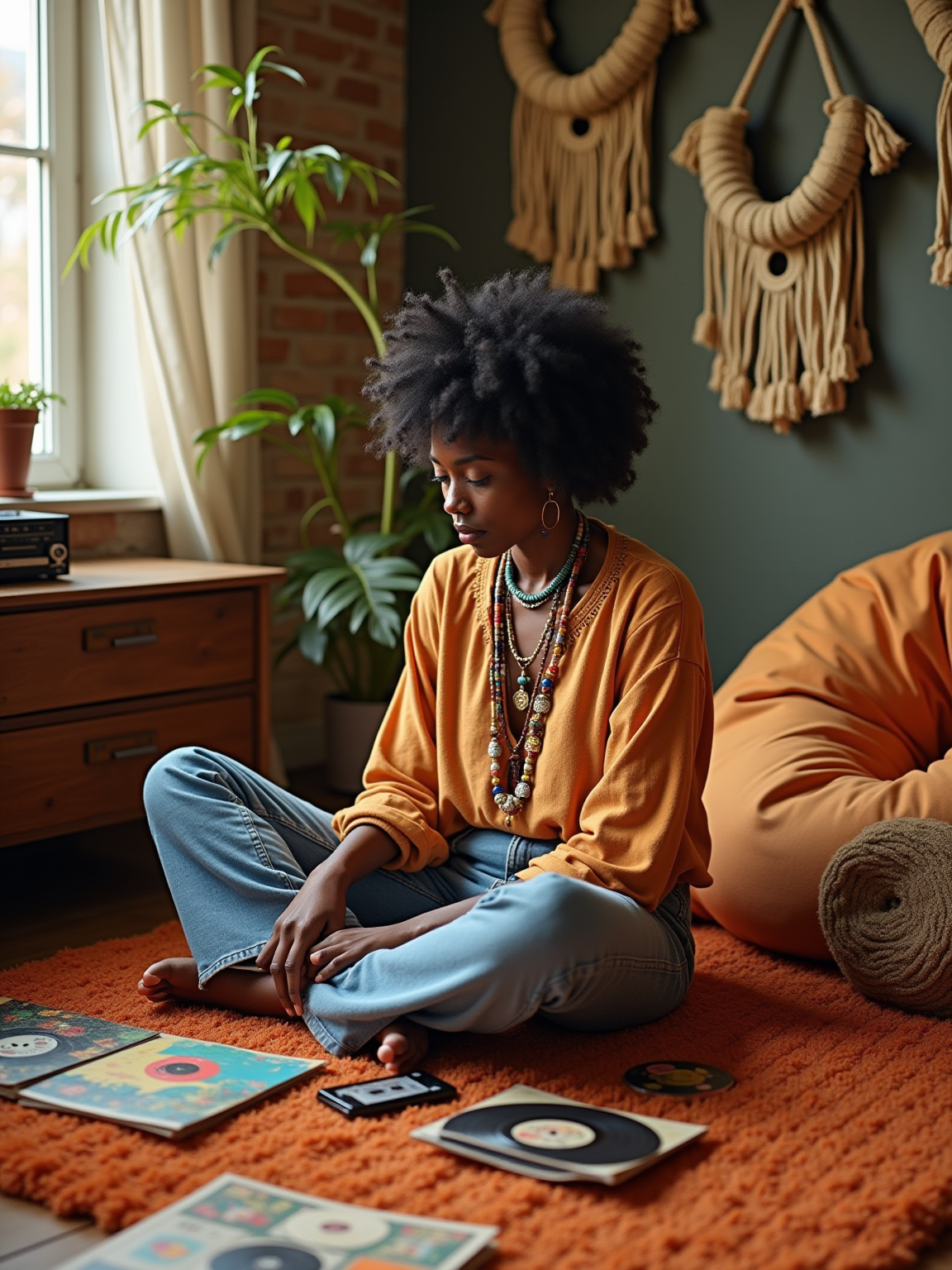 model sitting cross-legged on orange shag carpet, wearing peasant blouse with bell-bottom jeans and love beads , organizing a collection of vinyl LPs and 45s, portable stereo with cassette deck nearby, bean bag chairs and hanging macramé planters decorating the room