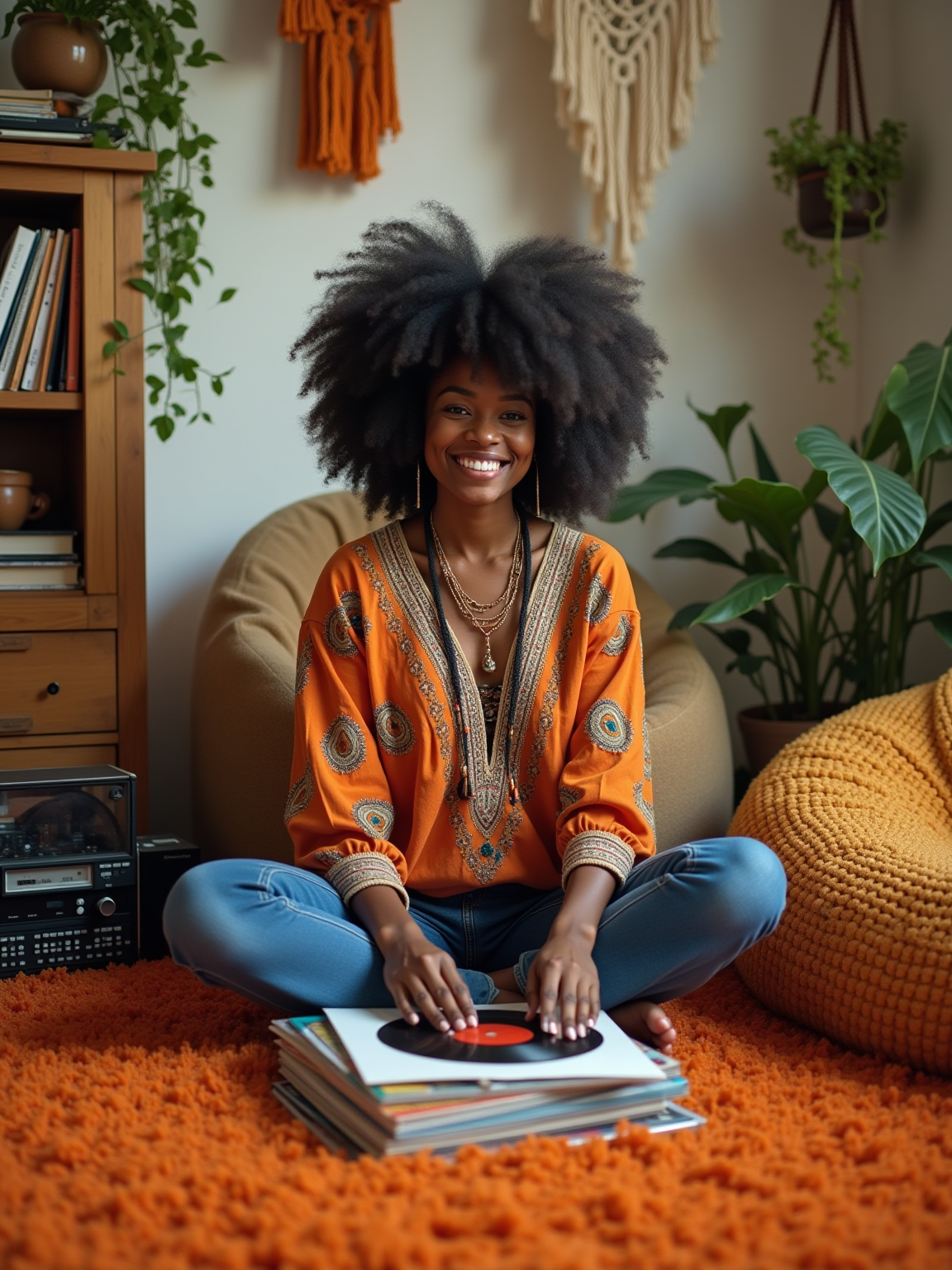 model sitting cross-legged on orange shag carpet, wearing peasant blouse with bell-bottom jeans and love beads , organizing a collection of vinyl LPs and 45s, portable stereo with cassette deck nearby, bean bag chairs and hanging macramé planters decorating the room