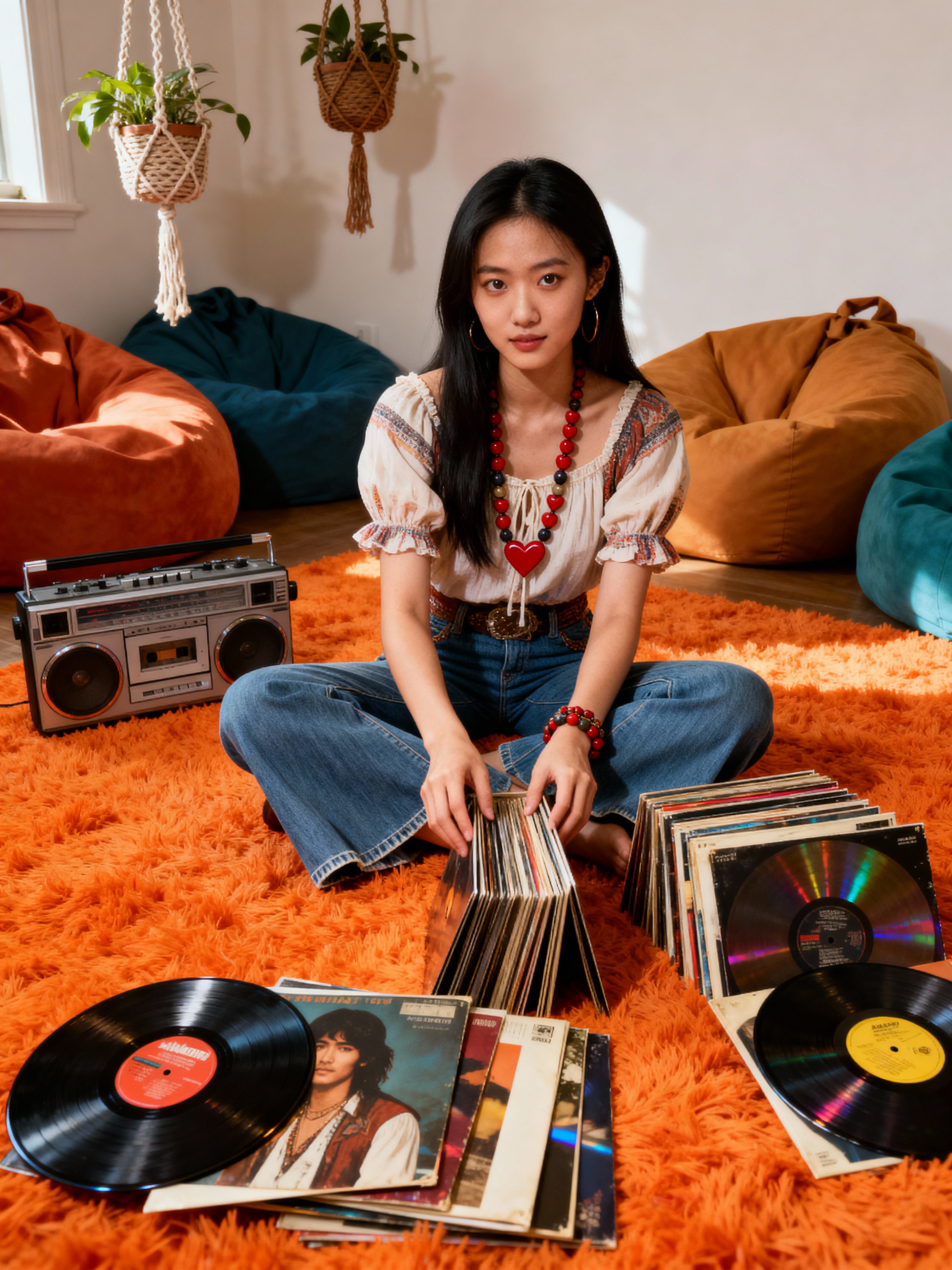 model sitting cross-legged on orange shag carpet, wearing peasant blouse with bell-bottom jeans and love beads , organizing a collection of vinyl LPs and 45s, portable stereo with cassette deck nearby, bean bag chairs and hanging macramé planters decorating the room